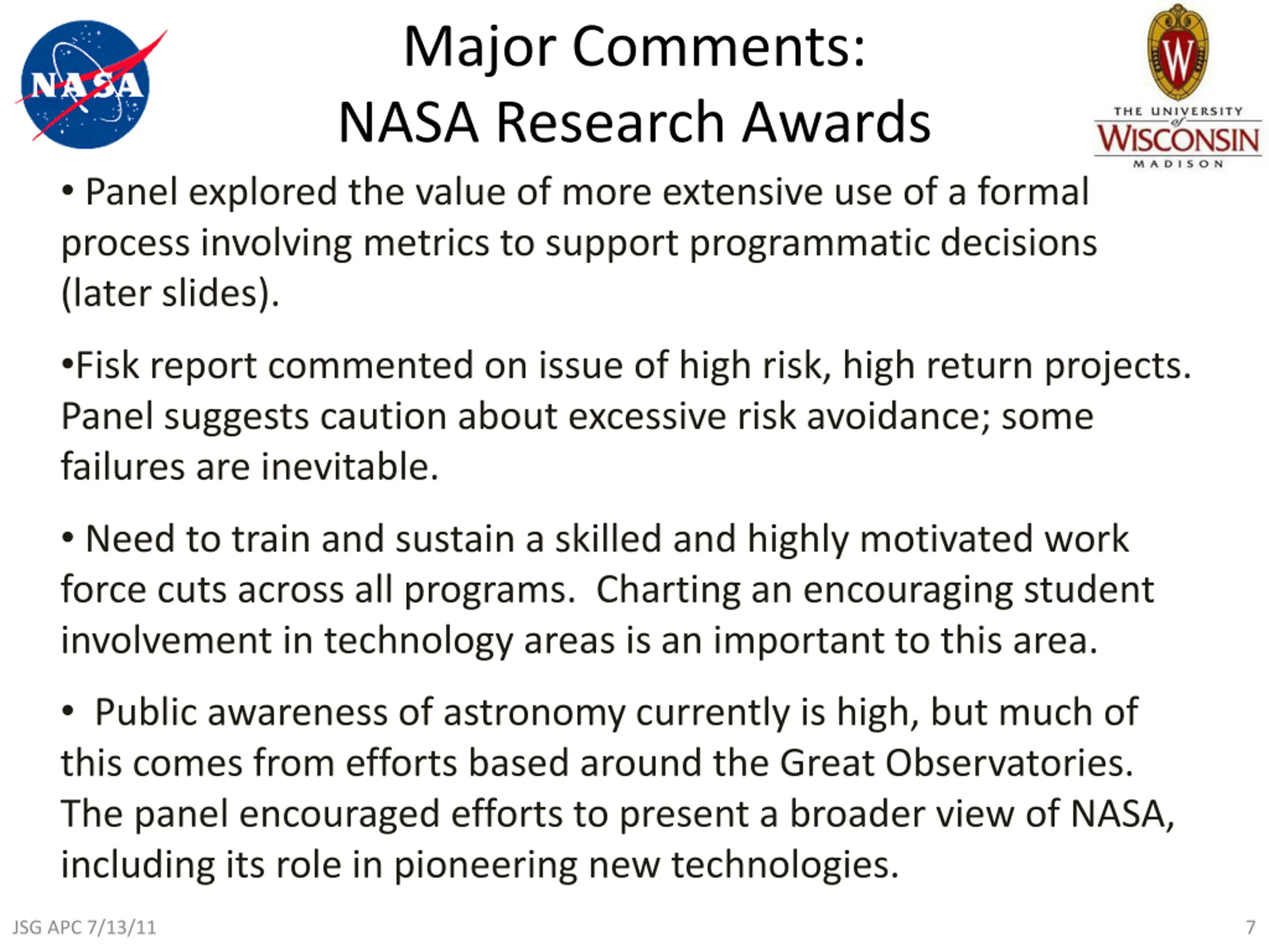 Major Comments: NASA Research Awards Panel explored the value of more extensive use of a formal process involving metrics to support programmatic decisions (later slides). Fisk report commented on issue of high risk, high return projects. Panel suggests caution about excessive risk avoidance; some failures are inevitable. Need to train and sustain a skilled and highly motivated work force cuts across all programs. Charting an encouraging student involvement in technology areas is an important to this area. Public awareness of astronomy currently is high, but much of this comes from efforts based around the Great Observatories. The panel encouraged efforts to present a broader view of NASA, including its role in pioneering new technologies. JSG APC 7/13/11 7