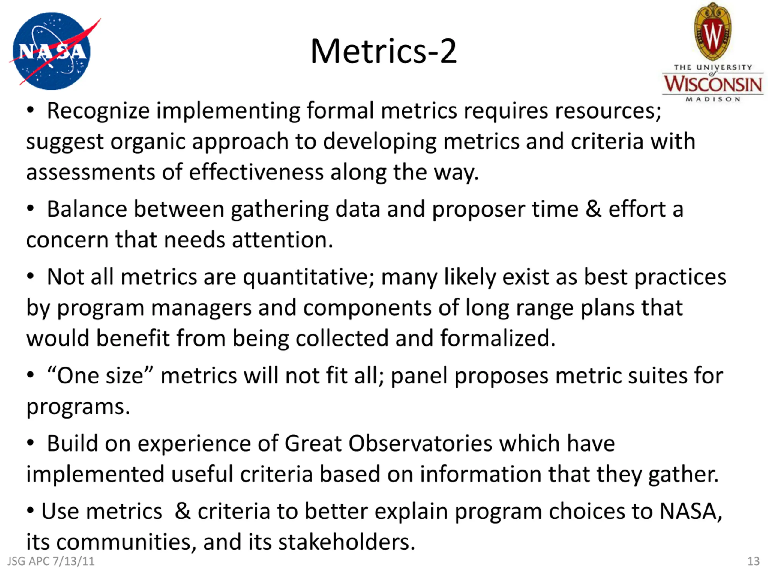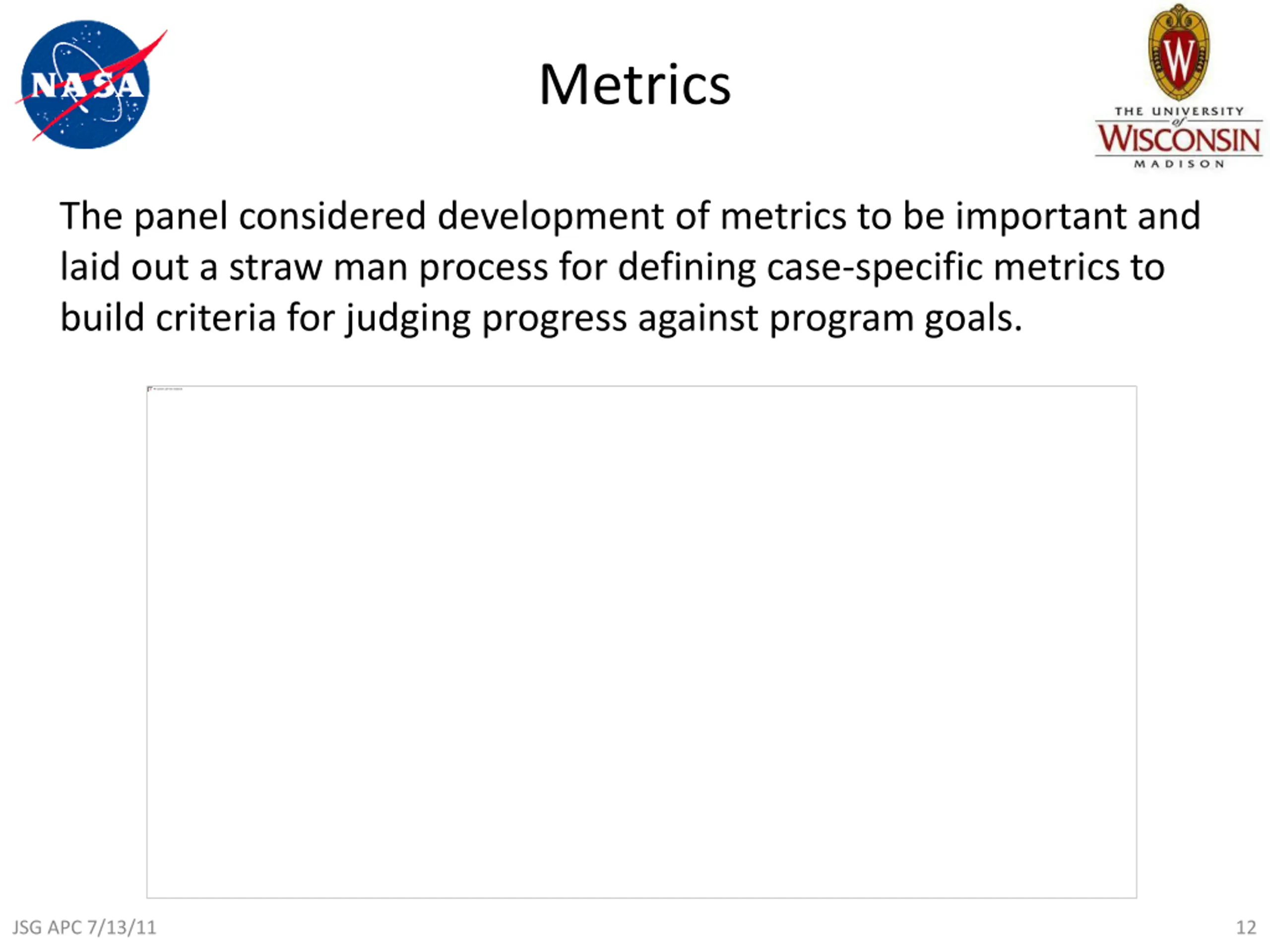 Metrics The panel considered development of metrics to be important and laid out a straw man process for defining case-specific metrics to build criteria for judging progress against program goals. JSG APC 7/13/11 12