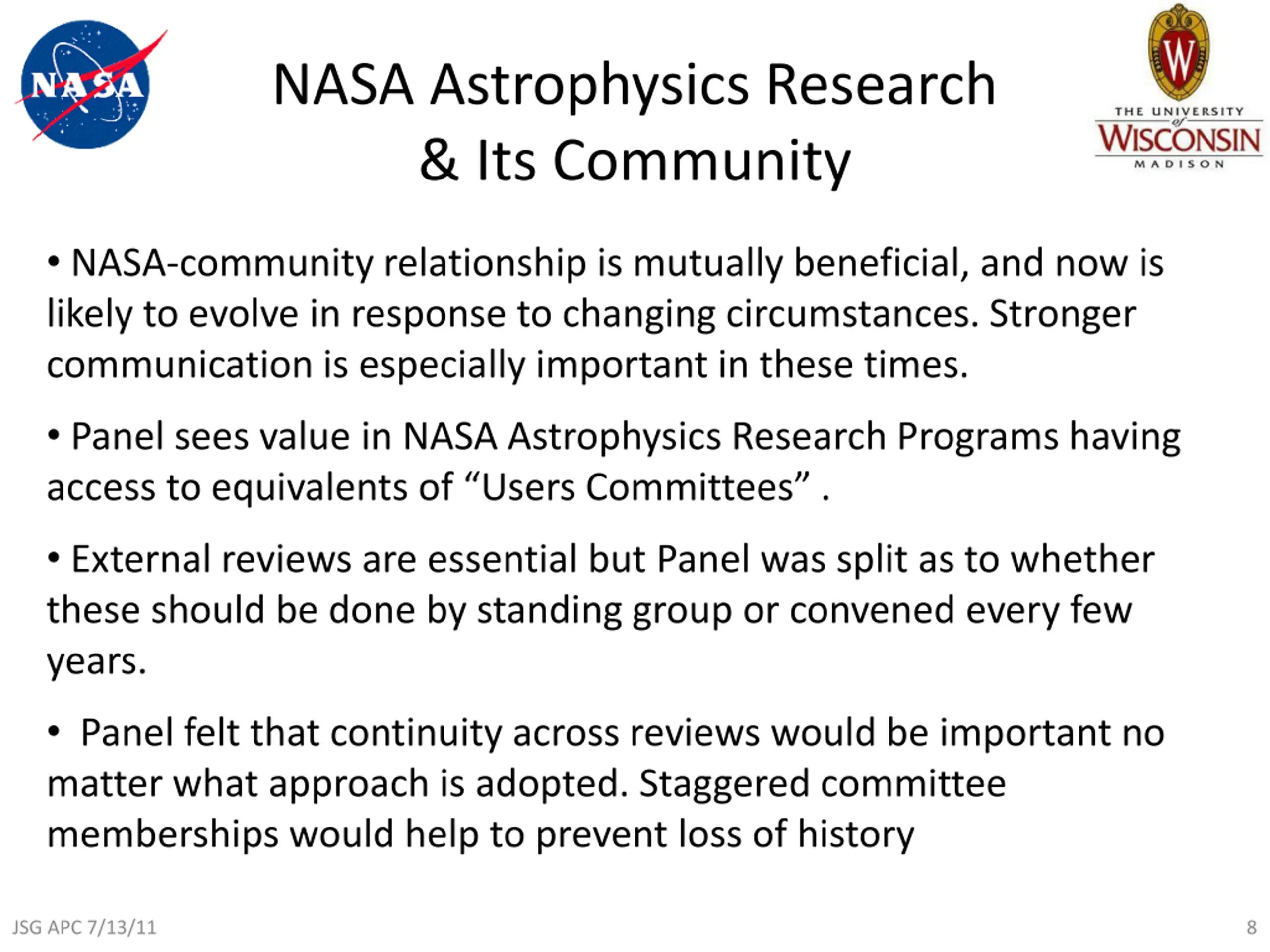 NASA Astrophysics Research & Its Community NASA-community relationship is mutually beneficial, and now is likely to evolve in response to changing circumstances. Stronger communication is especially important in these times. Panel sees value in NASA Astrophysics Research Programs having access to equivalents of Users Committees . External reviews are essential but Panel was split as to whether these should be done by standing group or convened every few years. Panel felt that continuity across reviews would be important no matter what approach is adopted. Staggered committee memberships would help to prevent loss of history JSG APC 7/13/11 8