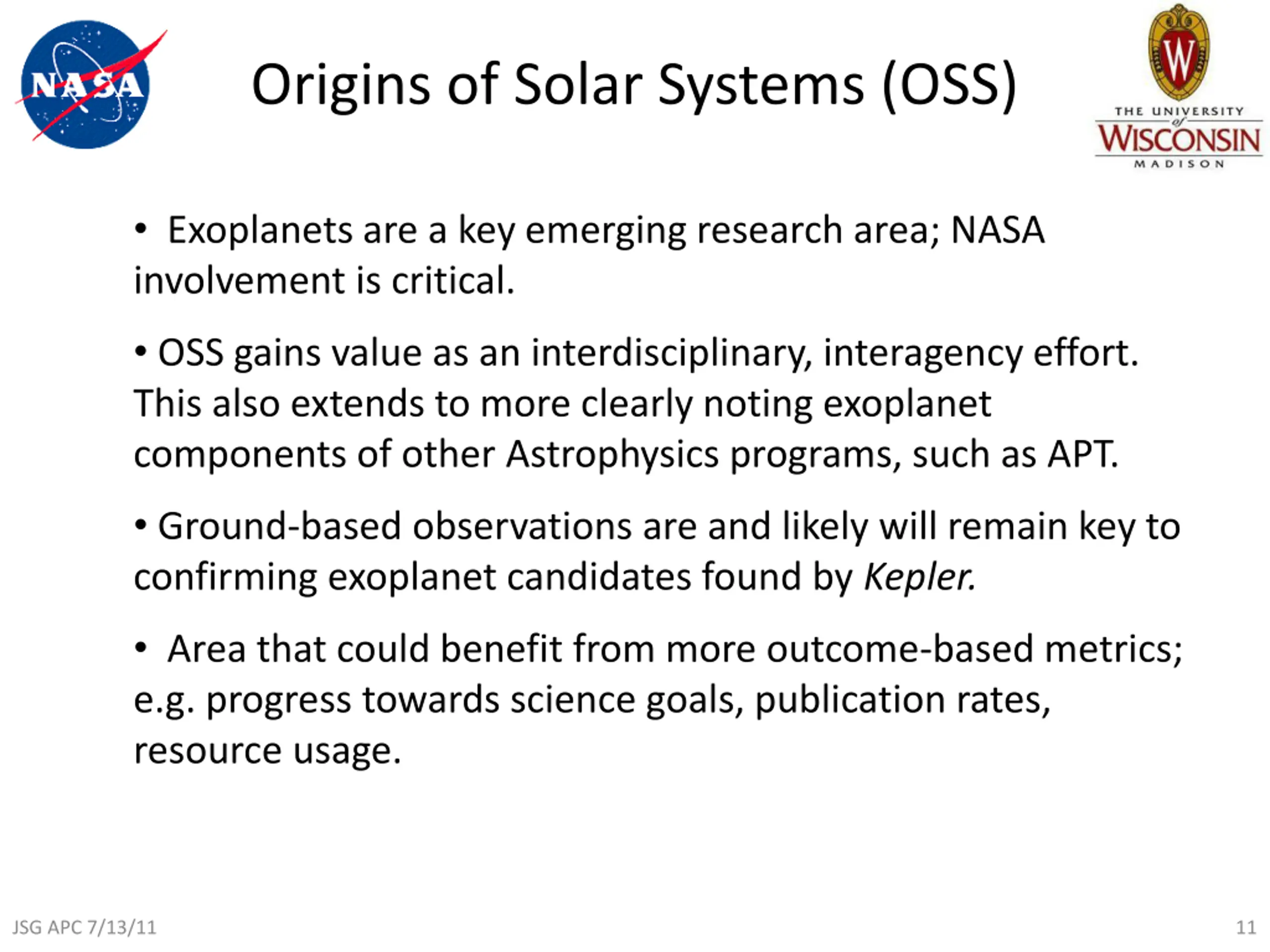 Origins of Solar Systems (OSS) Exoplanets are a key emerging research area; NASA involvement is critical. OSS gains value as an interdisciplinary, interagency effort. This also extends to more clearly noting exoplanet components of other Astrophysics programs, such as APT. Ground-based observations are and likely will remain key to confirming exoplanet candidates found by Kepler. Area that could benefit from more outcome-based metrics; e.g. progress towards science goals, publication rates, resource usage. JSG APC 7/13/11 11