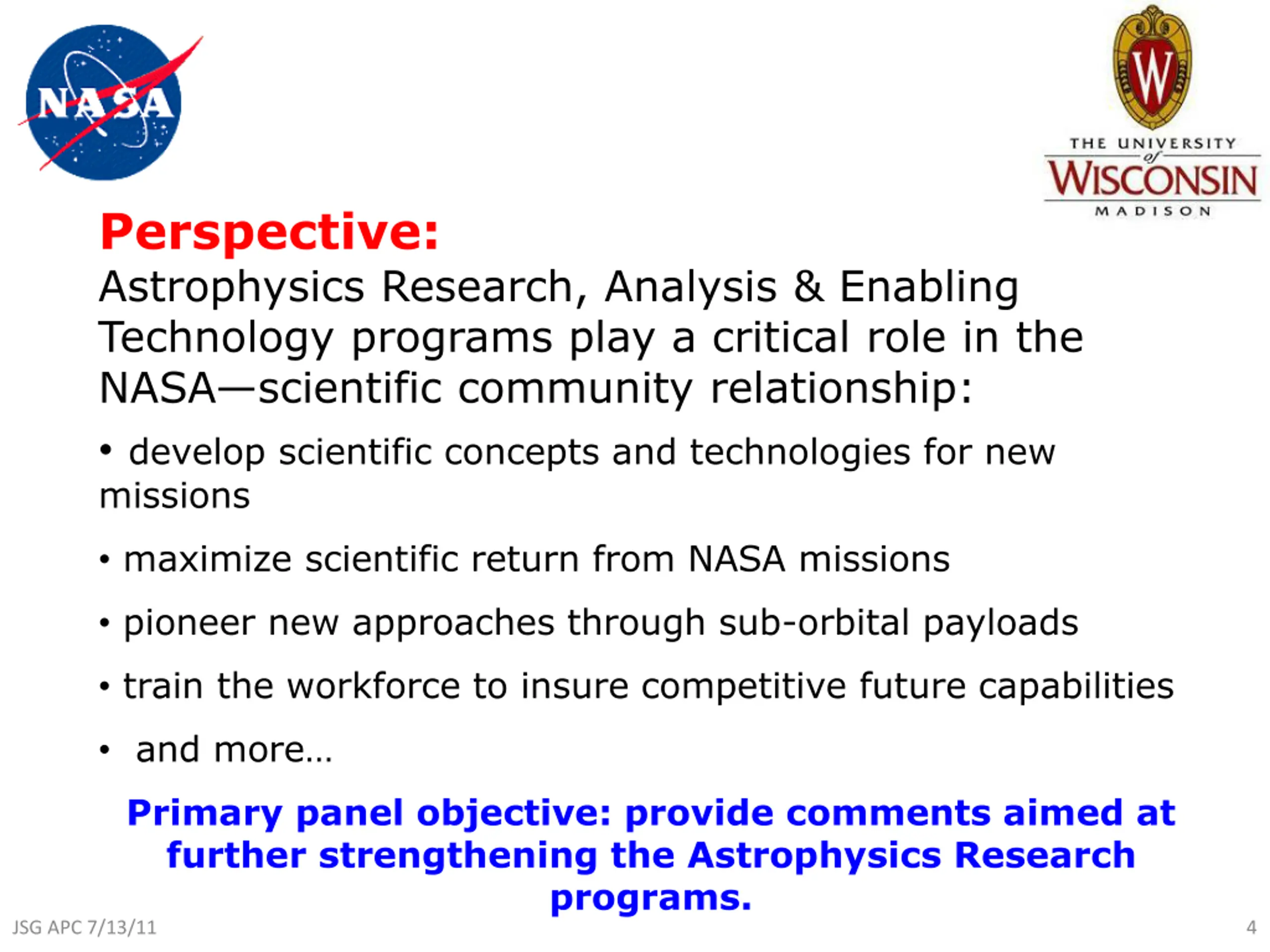 Perspective: Astrophysics Research, Analysis & Enabling Technology programs play a critical role in the NASA scientific community relationship: develop scientific concepts and technologies for new missions maximize scientific return from NASA missions pioneer new approaches through sub-orbital payloads train the workforce to insure competitive future capabilities and more Primary panel objective: provide comments aimed at further strengthening the Astrophysics Research programs. JSG APC 7/13/11 4