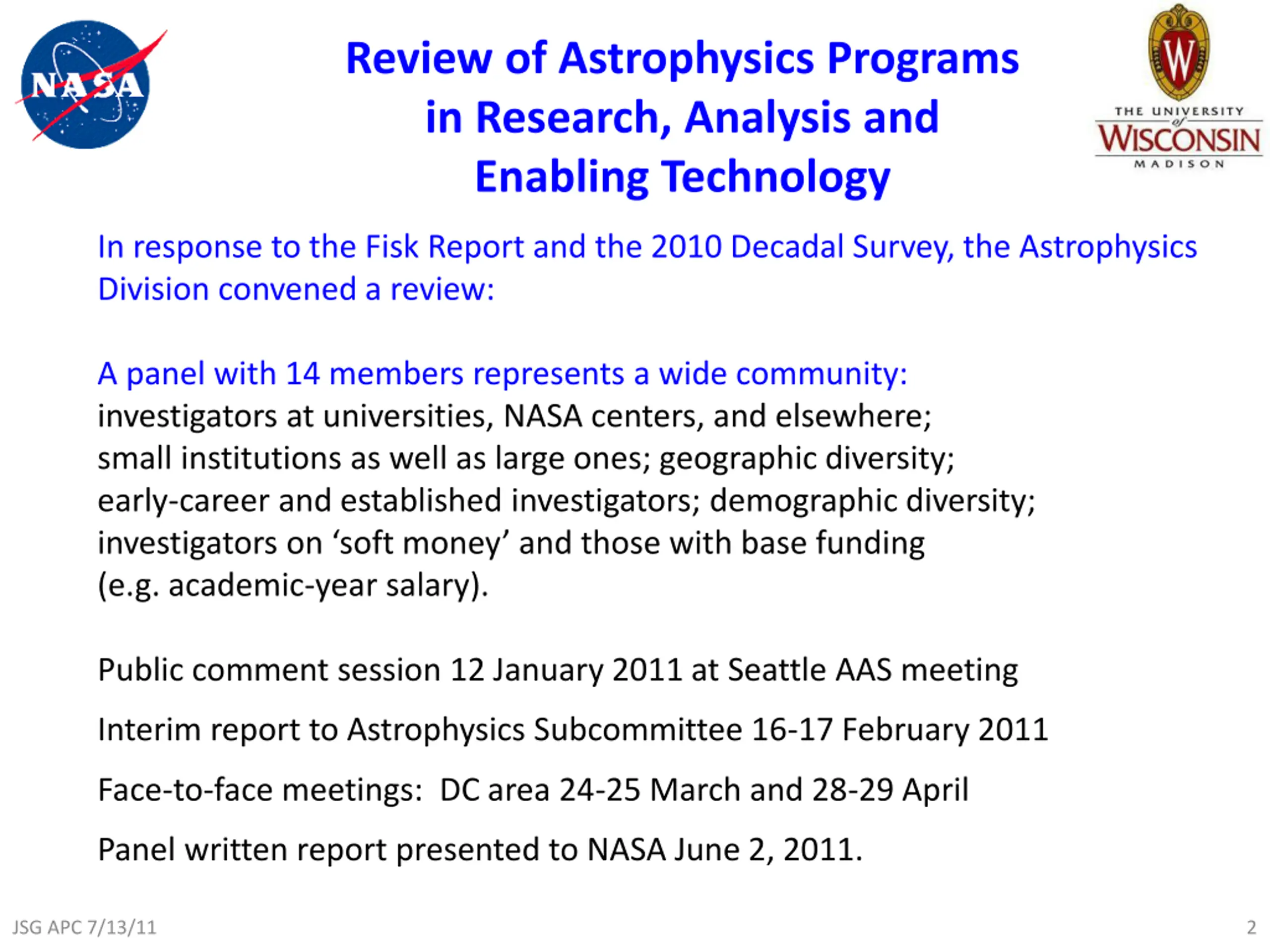 Review of Astrophysics Programs in Research, Analysis and Enabling Technology In response to the Fisk Report and the 2010 Decadal Survey, the Astrophysics Division convened a review: A panel with 14 members represents a wide community: investigators at universities, NASA centers, and elsewhere; small institutions as well as large ones; geographic diversity; early-career and established investigators; demographic diversity; investigators on soft money and those with base funding (e.g. academic-year salary). Public comment session 12 January 2011 at Seattle AAS meeting Interim report to Astrophysics Subcommittee 16-17 February 2011 Face-to-face meetings: DC area 24-25 March and 28-29 April Panel written report presented to NASA June 2, 2011. JSG APC 7/13/11 2