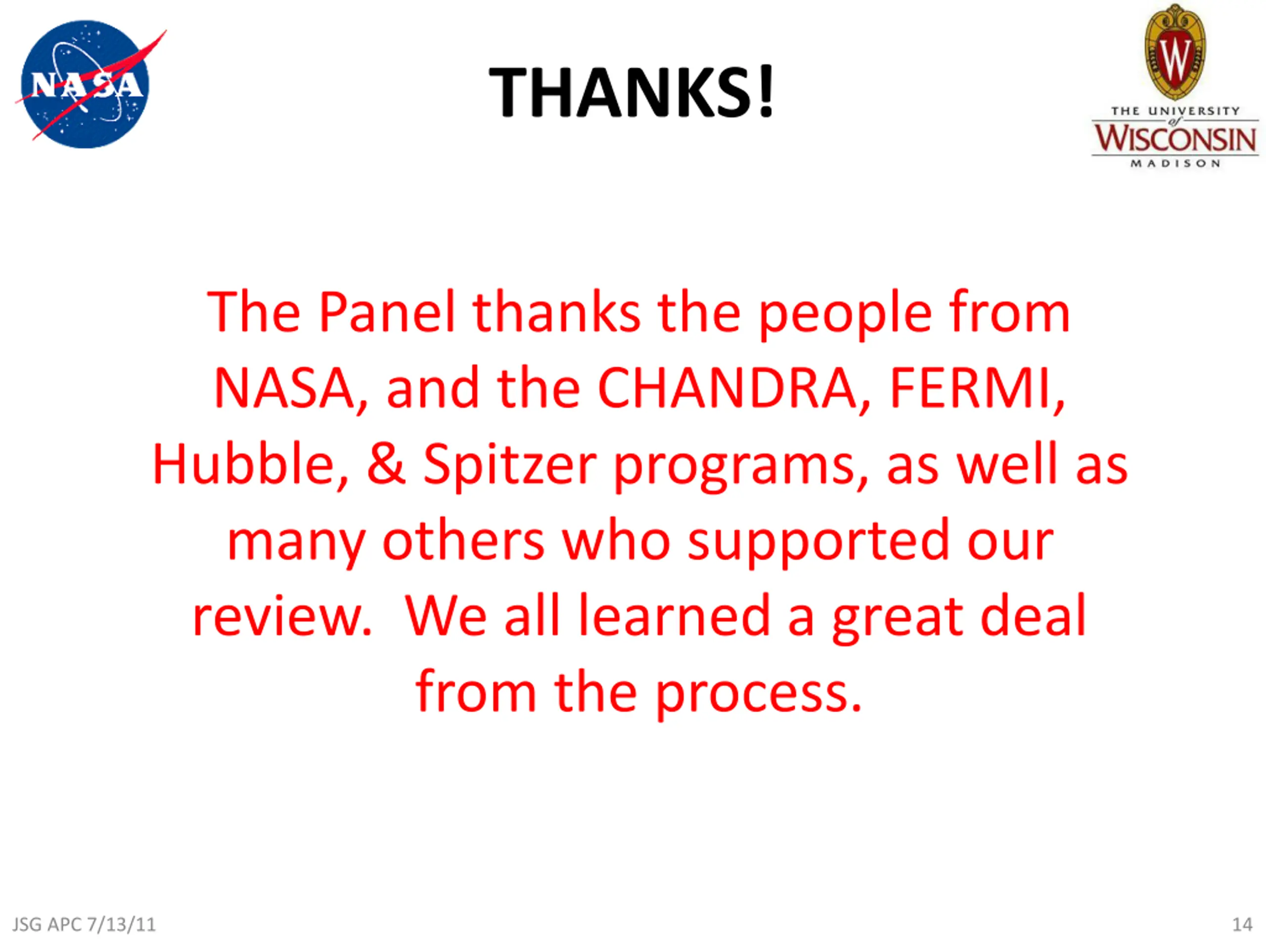 THANKS! The Panel thanks the people from NASA, and the CHANDRA, FERMI, Hubble, & Spitzer programs, as well as many others who supported our review. We all learned a great deal from the process. JSG APC 7/13/11 14