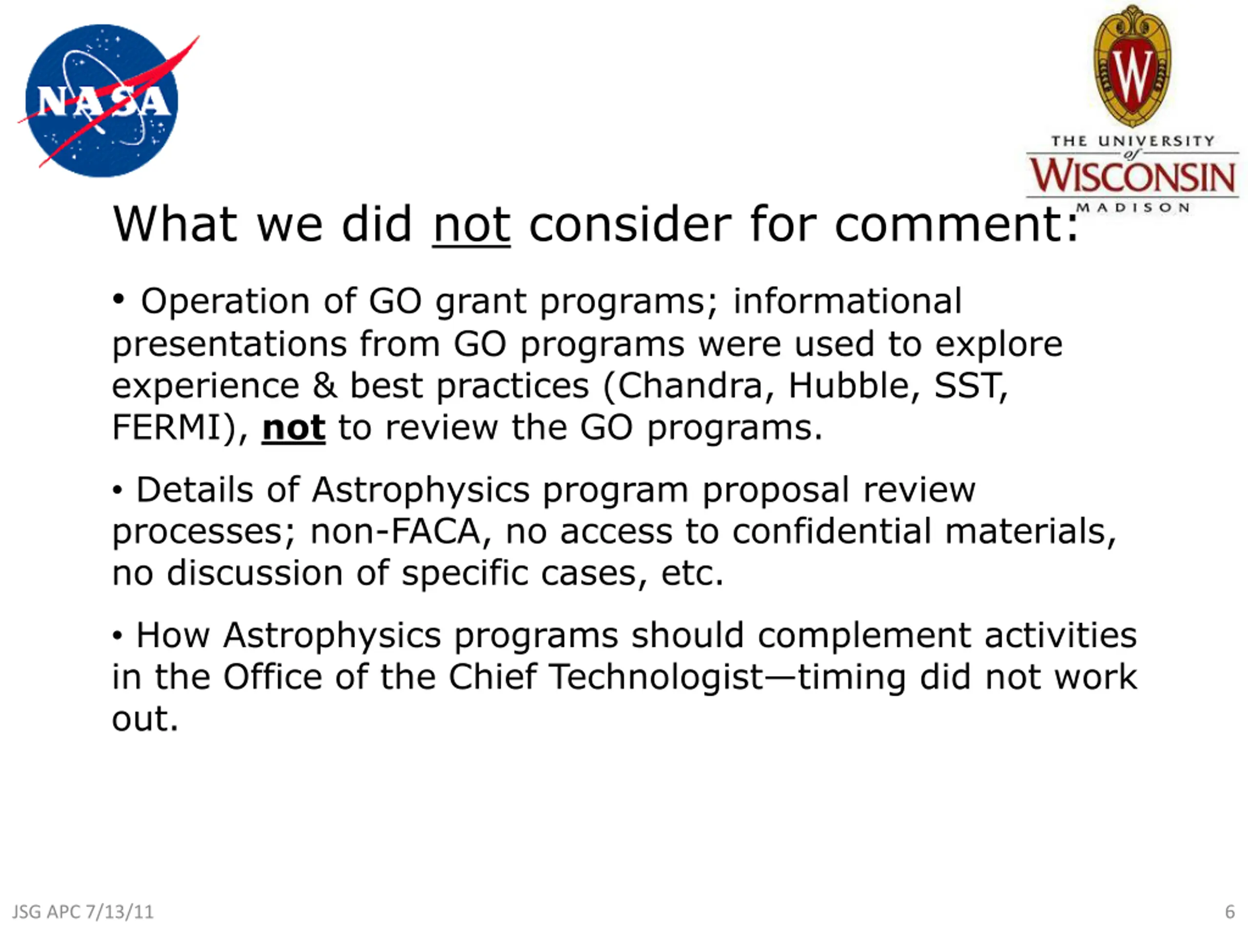 What we did not consider for comment: Operation of GO grant programs; informational presentations from GO programs were used to explore experience & best practices (Chandra, Hubble, SST, FERMI), not to review the GO programs. Details of Astrophysics program proposal review processes; non-FACA, no access to confidential materials, no discussion of specific cases, etc. How Astrophysics programs should complement activities in the Office of the Chief Technologist timing did not work out. JSG APC 7/13/11 6
