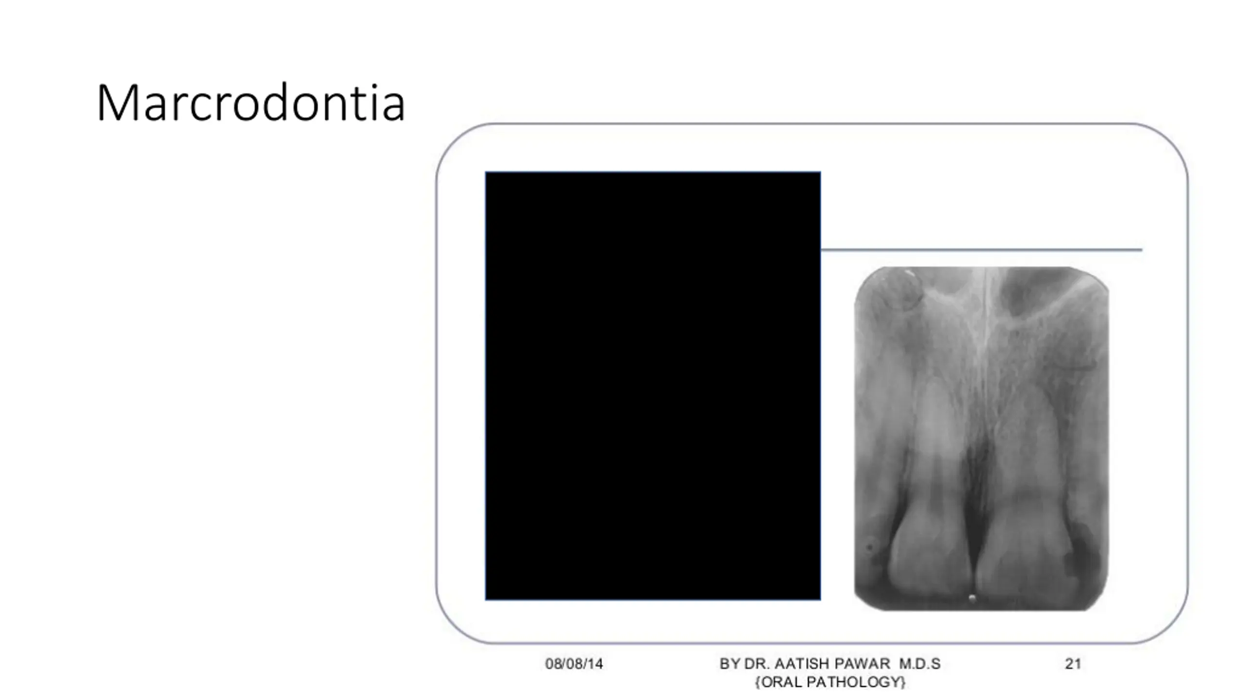 True Anodontia, Partial True Anodontia, Partial False Anodontia, Mesiodens/Supernumerary, Microdontia, Marcrodontia, Gemination/Right Fusion/Left, Peg-Lateral, Fusion Two Roots/Two Crowns, Dens in dente, Dilaceration, Concresences, Taurodontia, Hypercementosis, Amelogenesis Imperfecta, Dentinogenesis Imperfecta, Hutchinson Incisors, Mulberry Molars, Mental Foramens - Radiolucent.