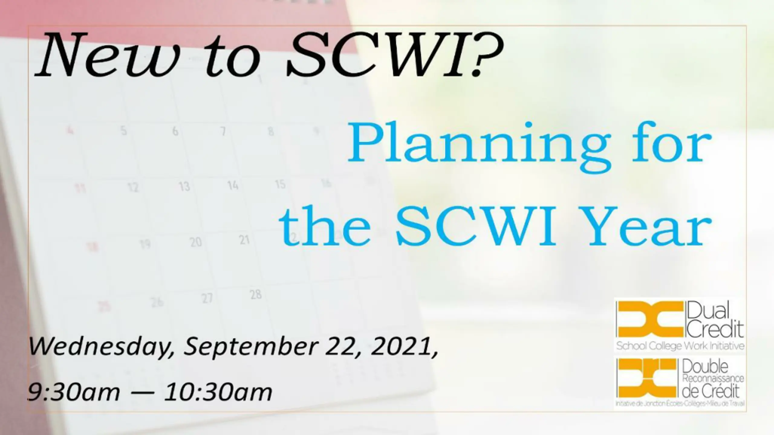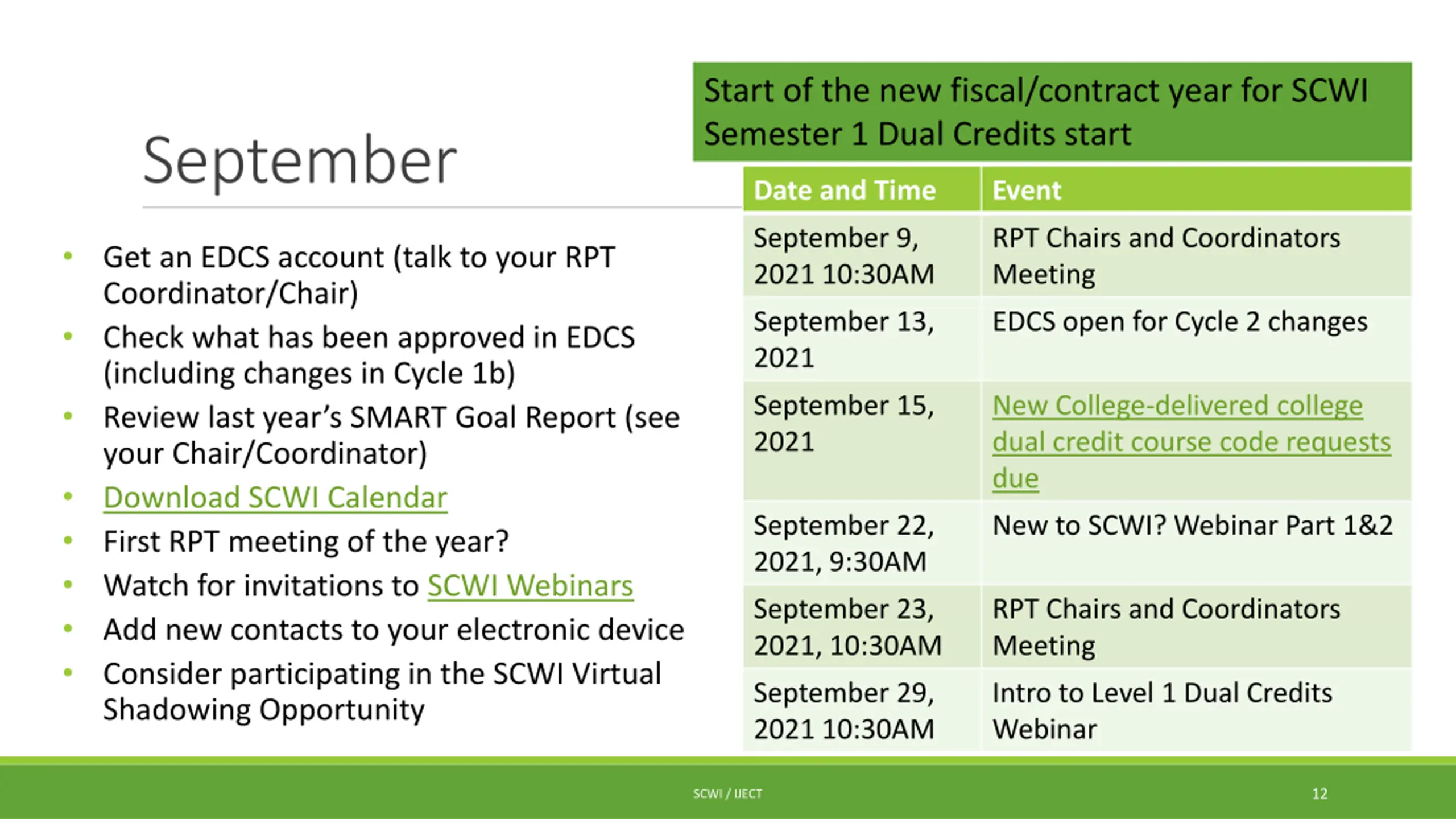 Start of the new fiscal/contract year for SCWI Semester 1 Dual Credits start September Date and Time Event September 9, 2021 10:30AM RPT Chairs and Coordinators Meeting Get an EDCS account (talk to your RPT Coordinator/Chair) Check what has been approved in EDCS (including changes in Cycle 1b) Review last year s SMART Goal Report (see your Chair/Coordinator) Download SCWI Calendar First RPT meeting of the year? Watch for invitations to SCWI Webinars Add new contacts to your electronic device Consider participating in the SCWI Virtual Shadowing Opportunity September 13, 2021 EDCS open for Cycle 2 changes September 15, 2021 New College-delivered college dual credit course code requests due September 22, 2021, 9:30AM New to SCWI? Webinar Part 1&2 September 23, 2021, 10:30AM RPT Chairs and Coordinators Meeting September 29, 2021 10:30AM Intro to Level 1 Dual Credits Webinar 12 SCWI / IJECT