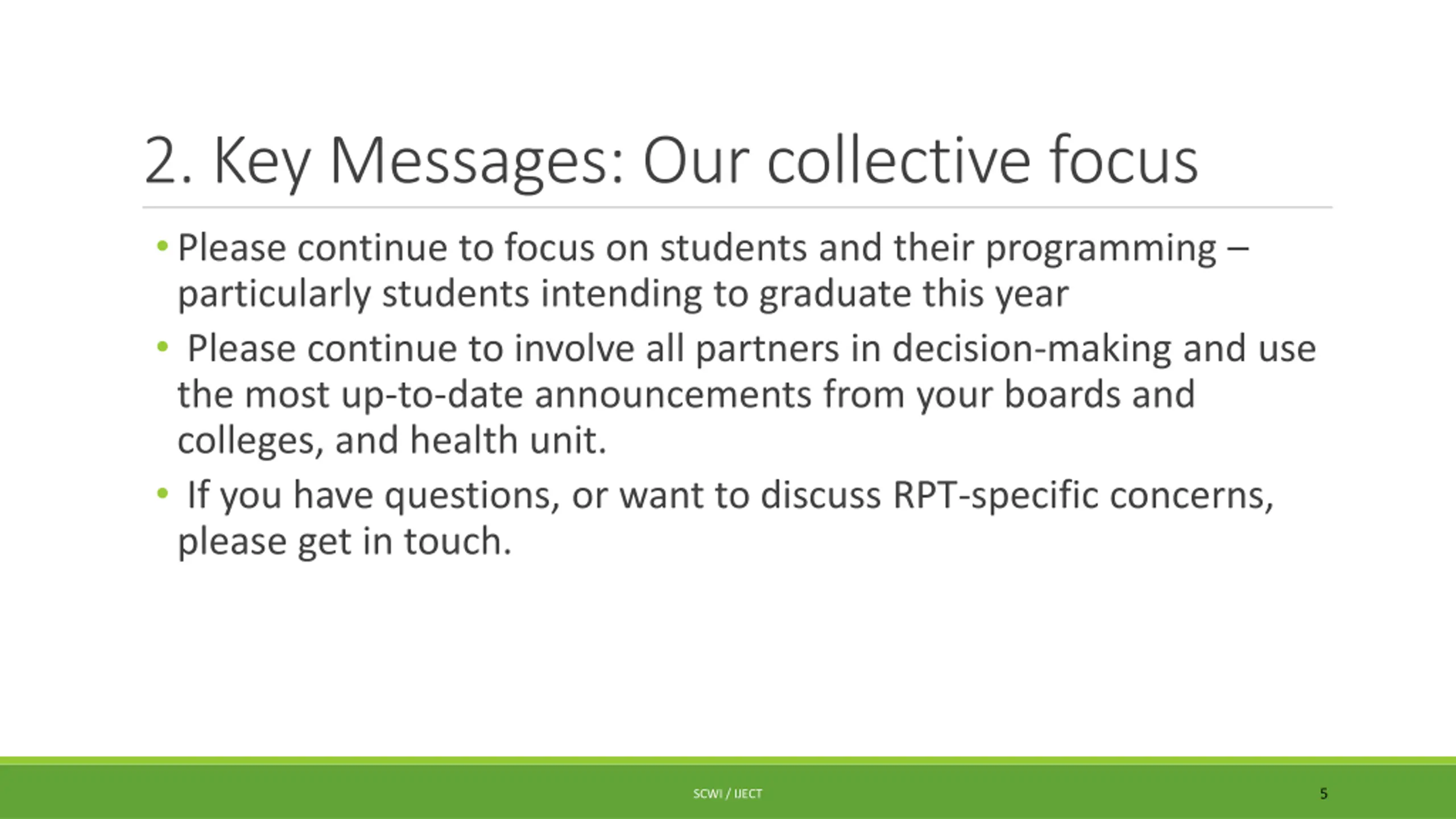 2. Key Messages: Our collective focus Please continue to focus on students and their programming particularly students intending to graduate this year Please continue to involve all partners in decision-making and use the most up-to-date announcements from your boards and colleges, and health unit. If you have questions, or want to discuss RPT-specific concerns, please get in touch. 5 SCWI / IJECT
