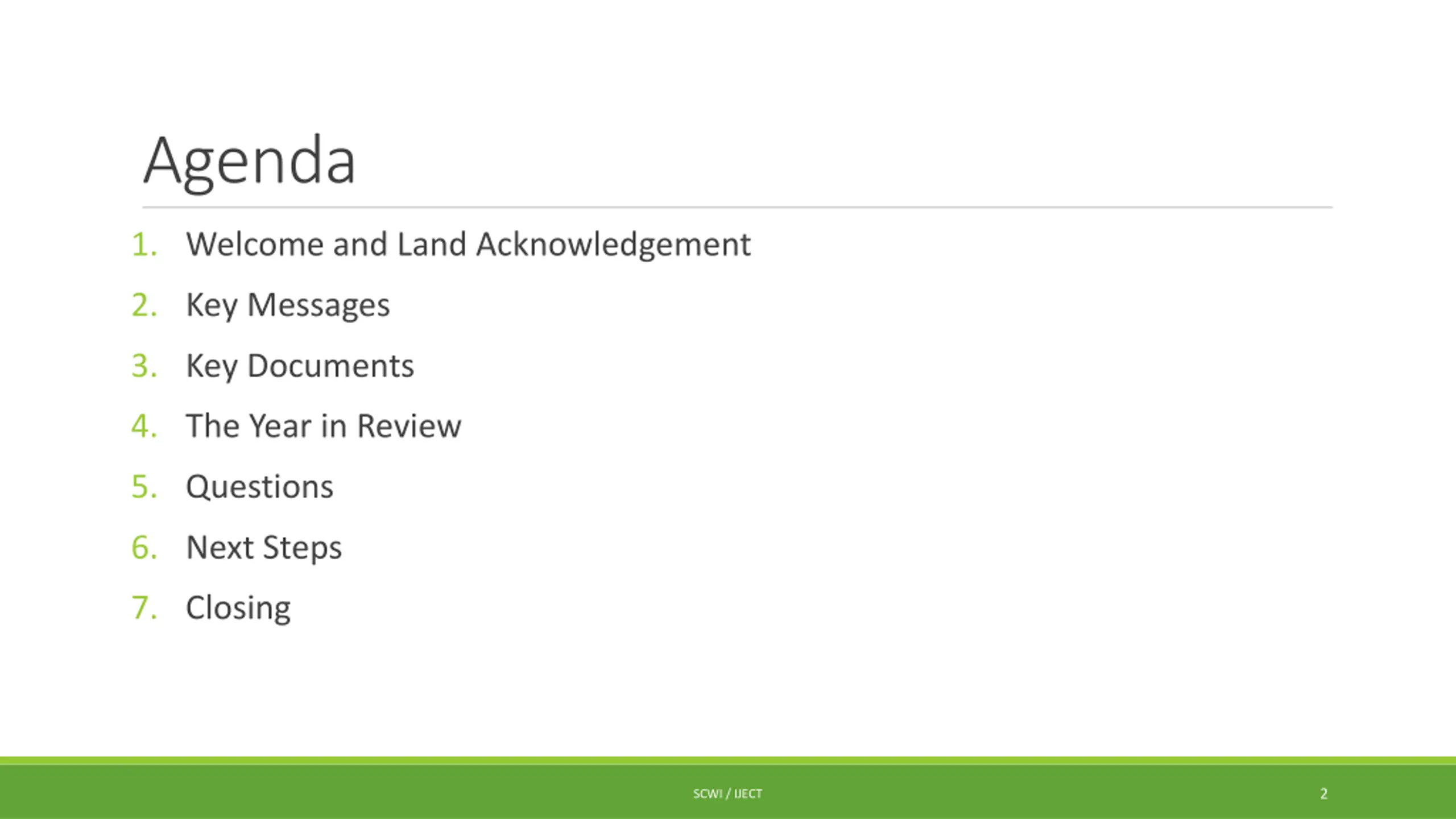 Agenda 1. Welcome and Land Acknowledgement 2. Key Messages 3. Key Documents 4. The Year in Review 5. Questions 6. Next Steps 7. Closing 2 SCWI / IJECT