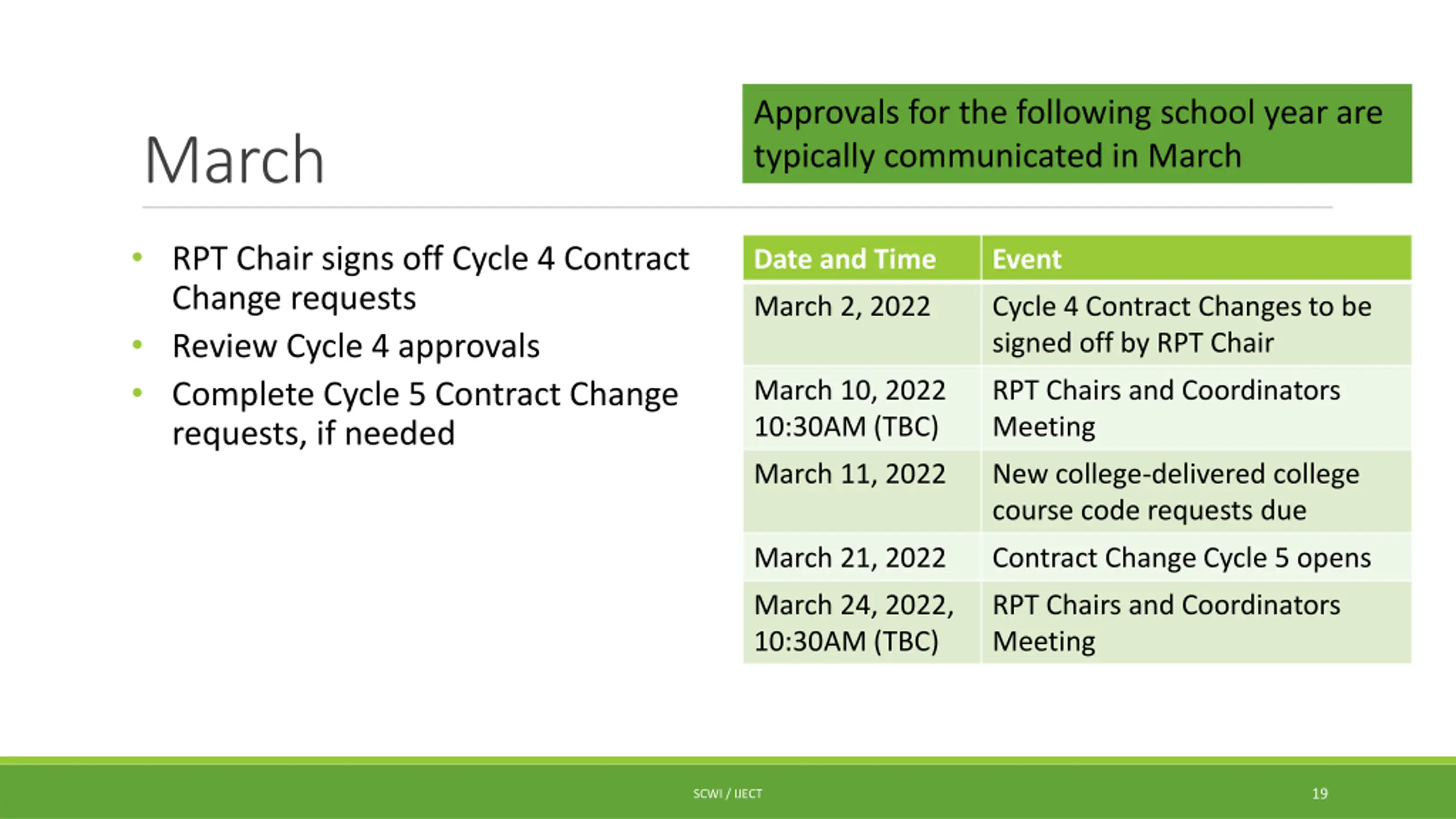 Approvals for the following school year are typically communicated in March March RPT Chair signs off Cycle 4 Contract Change requests Review Cycle 4 approvals Complete Cycle 5 Contract Change requests, if needed Date and Time Event March 2, 2022 Cycle 4 Contract Changes to be signed off by RPT Chair March 10, 2022 10:30AM (TBC) RPT Chairs and Coordinators Meeting March 11, 2022 New college-delivered college course code requests due March 21, 2022 Contract Change Cycle 5 opens March 24, 2022, 10:30AM (TBC) RPT Chairs and Coordinators Meeting 19 SCWI / IJECT