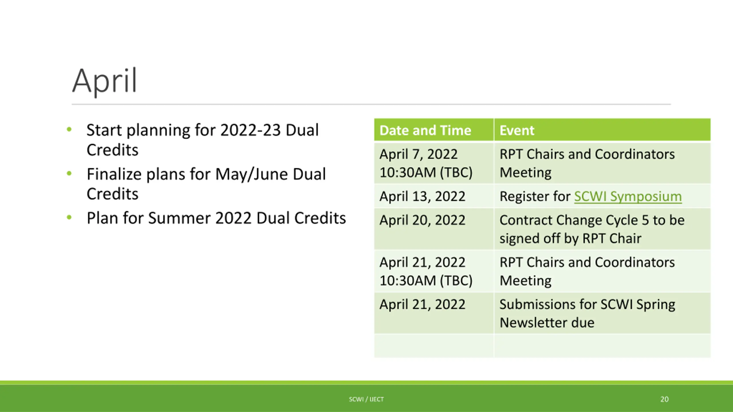 April Start planning for 2022-23 Dual Credits Finalize plans for May/June Dual Credits Plan for Summer 2022 Dual Credits Date and Time Event April 7, 2022 10:30AM (TBC) RPT Chairs and Coordinators Meeting April 13, 2022 Register for SCWI Symposium April 20, 2022 Contract Change Cycle 5 to be signed off by RPT Chair April 21, 2022 10:30AM (TBC) RPT Chairs and Coordinators Meeting April 21, 2022 Submissions for SCWI Spring Newsletter due 20 SCWI / IJECT