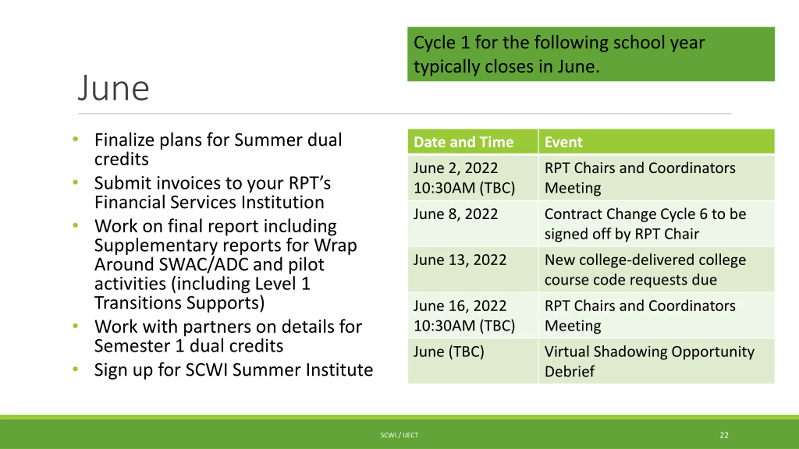 Cycle 1 for the following school year typically closes in June. June Finalize plans for Summer dual credits Submit invoices to your RPT s Financial Services Institution Work on final report including Supplementary reports for Wrap Around SWAC/ADC and pilot activities (including Level 1 Transitions Supports) Work with partners on details for Semester 1 dual credits Sign up for SCWI Summer Institute Date and Time Event June 2, 2022 10:30AM (TBC) RPT Chairs and Coordinators Meeting June 8, 2022 Contract Change Cycle 6 to be signed off by RPT Chair June 13, 2022 New college-delivered college course code requests due June 16, 2022 10:30AM (TBC) RPT Chairs and Coordinators Meeting June (TBC) Virtual Shadowing Opportunity Debrief 22 SCWI / IJECT