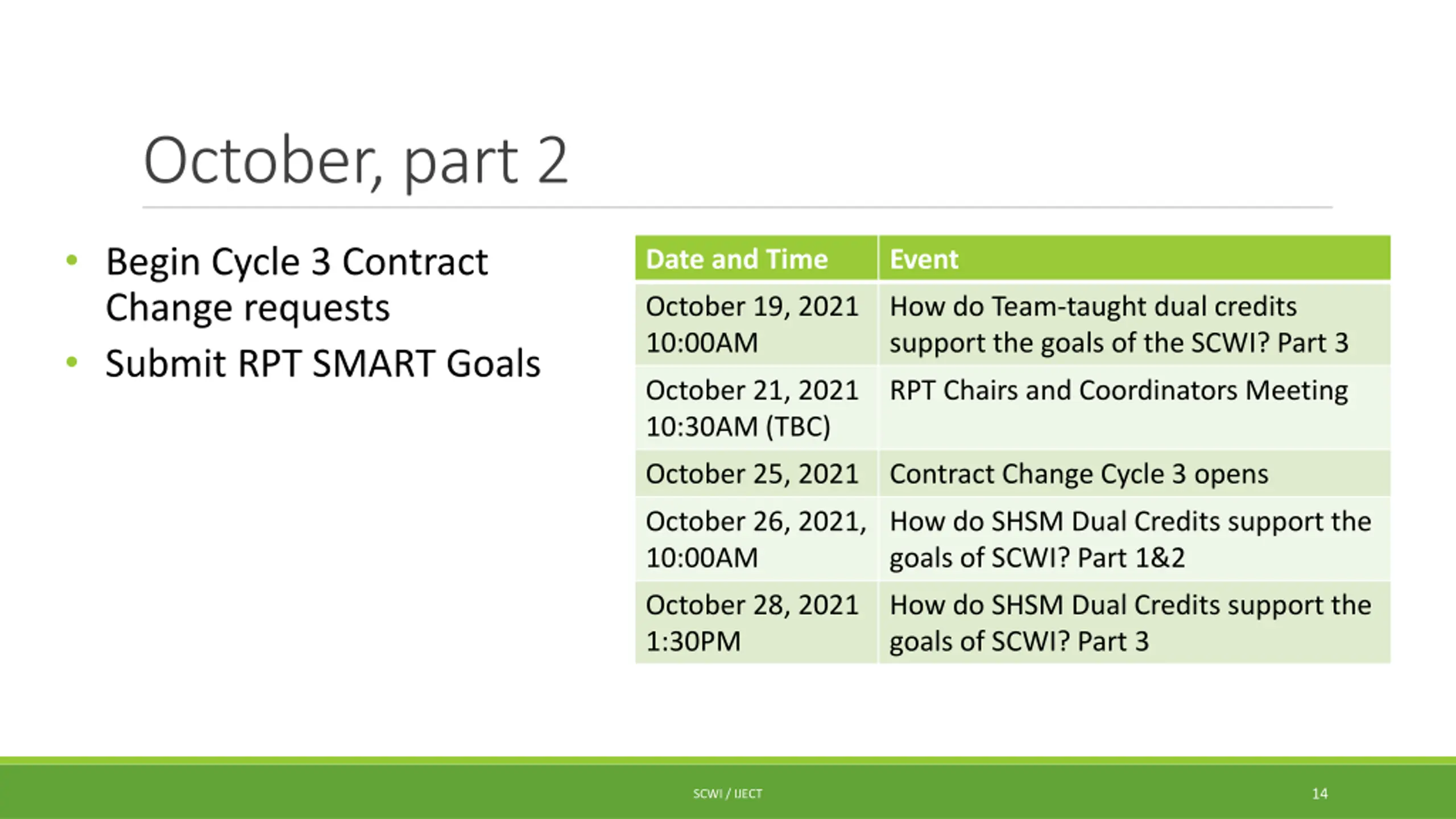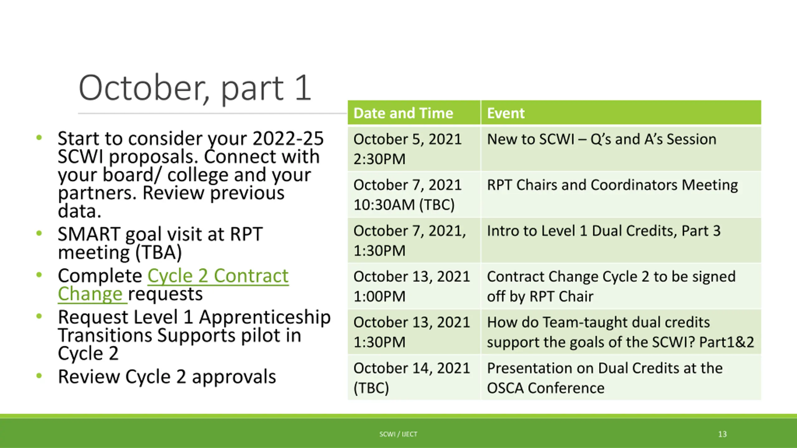 October, part 1 Date and Time Event Start to consider your 2022-25 SCWI proposals. Connect with your board/ college and your partners. Review previous data. SMART goal visit at RPT meeting (TBA) Complete Cycle 2 Contract Change requests Request Level 1 Apprenticeship Transitions Supports pilot in Cycle 2 Review Cycle 2 approvals October 5, 2021 2:30PM New to SCWI Q s and A s Session October 7, 2021 10:30AM (TBC) RPT Chairs and Coordinators Meeting October 7, 2021, 1:30PM Intro to Level 1 Dual Credits, Part 3 October 13, 2021 1:00PM Contract Change Cycle 2 to be signed off by RPT Chair October 13, 2021 1:30PM How do Team-taught dual credits support the goals of the SCWI? Part1&2 October 14, 2021 (TBC) Presentation on Dual Credits at the OSCA Conference 13 SCWI / IJECT