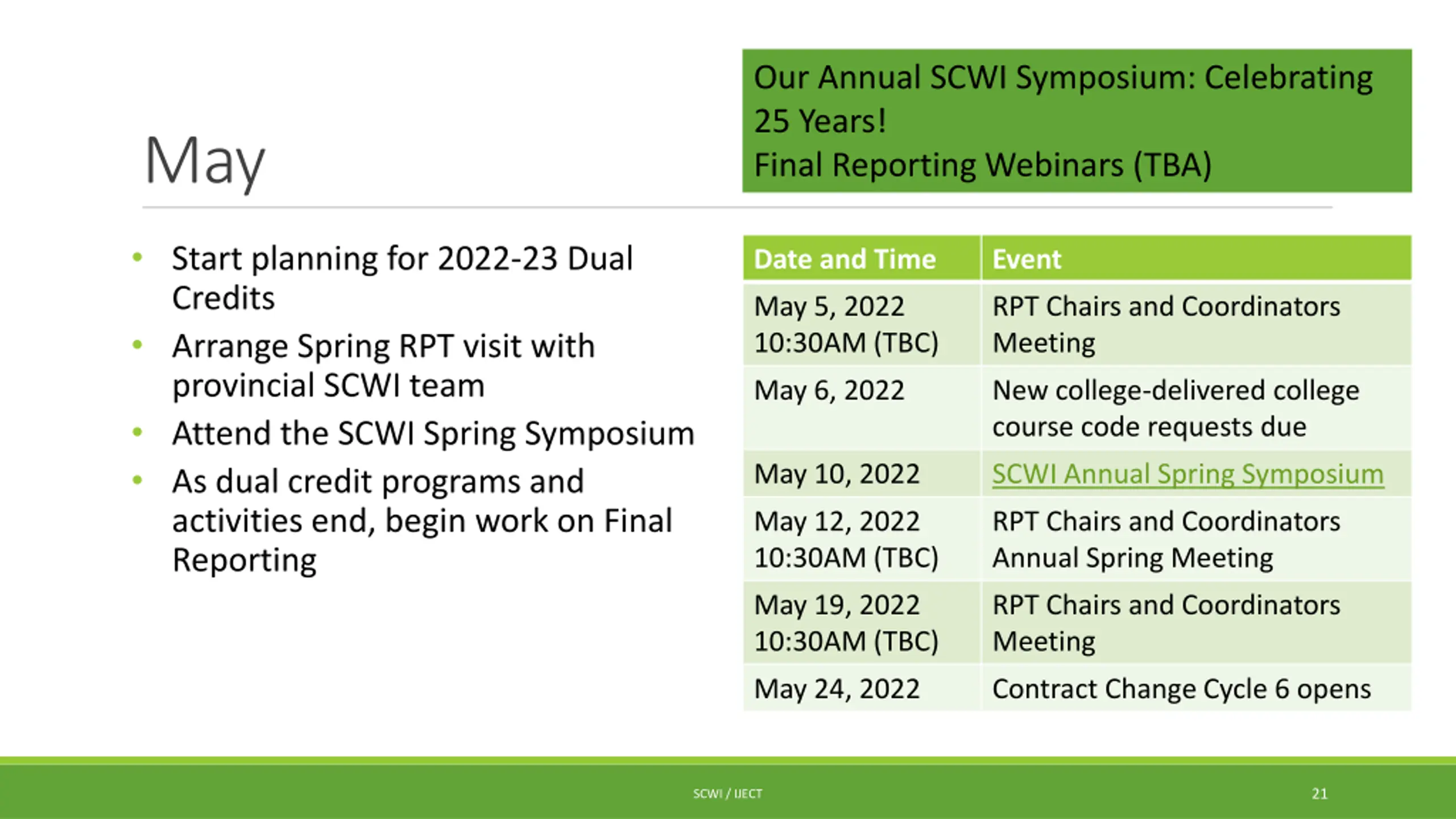 Our Annual SCWI Symposium: Celebrating 25 Years! Final Reporting Webinars (TBA) May Start planning for 2022-23 Dual Credits Arrange Spring RPT visit with provincial SCWI team Attend the SCWI Spring Symposium As dual credit programs and activities end, begin work on Final Reporting Date and Time Event May 5, 2022 10:30AM (TBC) RPT Chairs and Coordinators Meeting May 6, 2022 New college-delivered college course code requests due May 10, 2022 SCWI Annual Spring Symposium May 12, 2022 10:30AM (TBC) RPT Chairs and Coordinators Annual Spring Meeting May 19, 2022 10:30AM (TBC) RPT Chairs and Coordinators Meeting May 24, 2022 Contract Change Cycle 6 opens 21 SCWI / IJECT