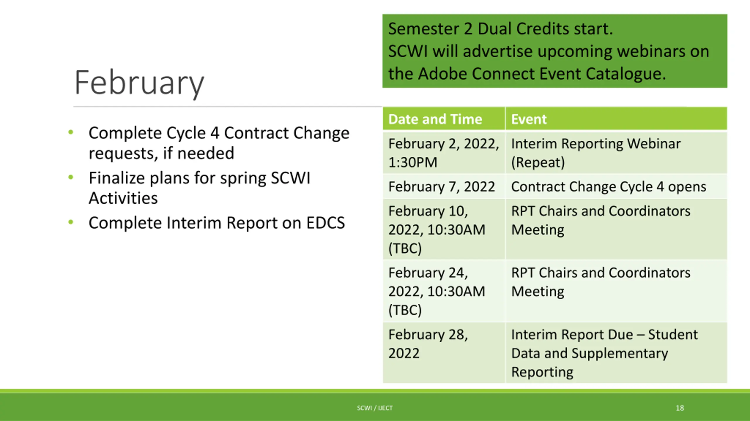 Semester 2 Dual Credits start. SCWI will advertise upcoming webinars on the Adobe Connect Event Catalogue. February Date and Time Event Complete Cycle 4 Contract Change requests, if needed Finalize plans for spring SCWI Activities Complete Interim Report on EDCS February 2, 2022, 1:30PM Interim Reporting Webinar (Repeat) February 7, 2022 Contract Change Cycle 4 opens February 10, 2022, 10:30AM (TBC) RPT Chairs and Coordinators Meeting February 24, 2022, 10:30AM (TBC) RPT Chairs and Coordinators Meeting February 28, 2022 Interim Report Due Student Data and Supplementary Reporting 18 SCWI / IJECT