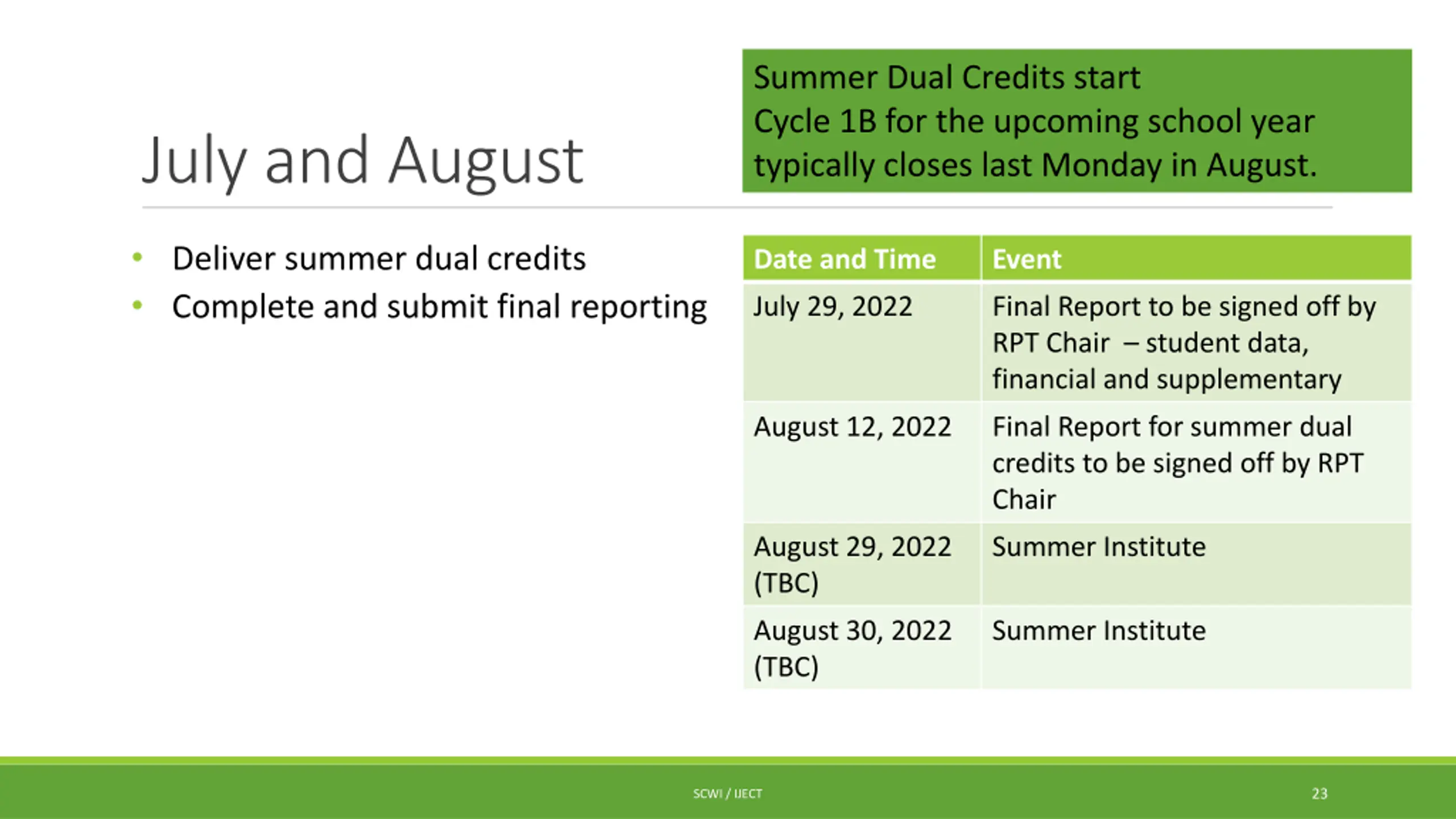 Summer Dual Credits start Cycle 1B for the upcoming school year typically closes last Monday in August. July and August Deliver summer dual credits Complete and submit final reporting Date and Time Event July 29, 2022 Final Report to be signed off by RPT Chair student data, financial and supplementary August 12, 2022 Final Report for summer dual credits to be signed off by RPT Chair August 29, 2022 (TBC) Summer Institute August 30, 2022 (TBC) Summer Institute 23 SCWI / IJECT