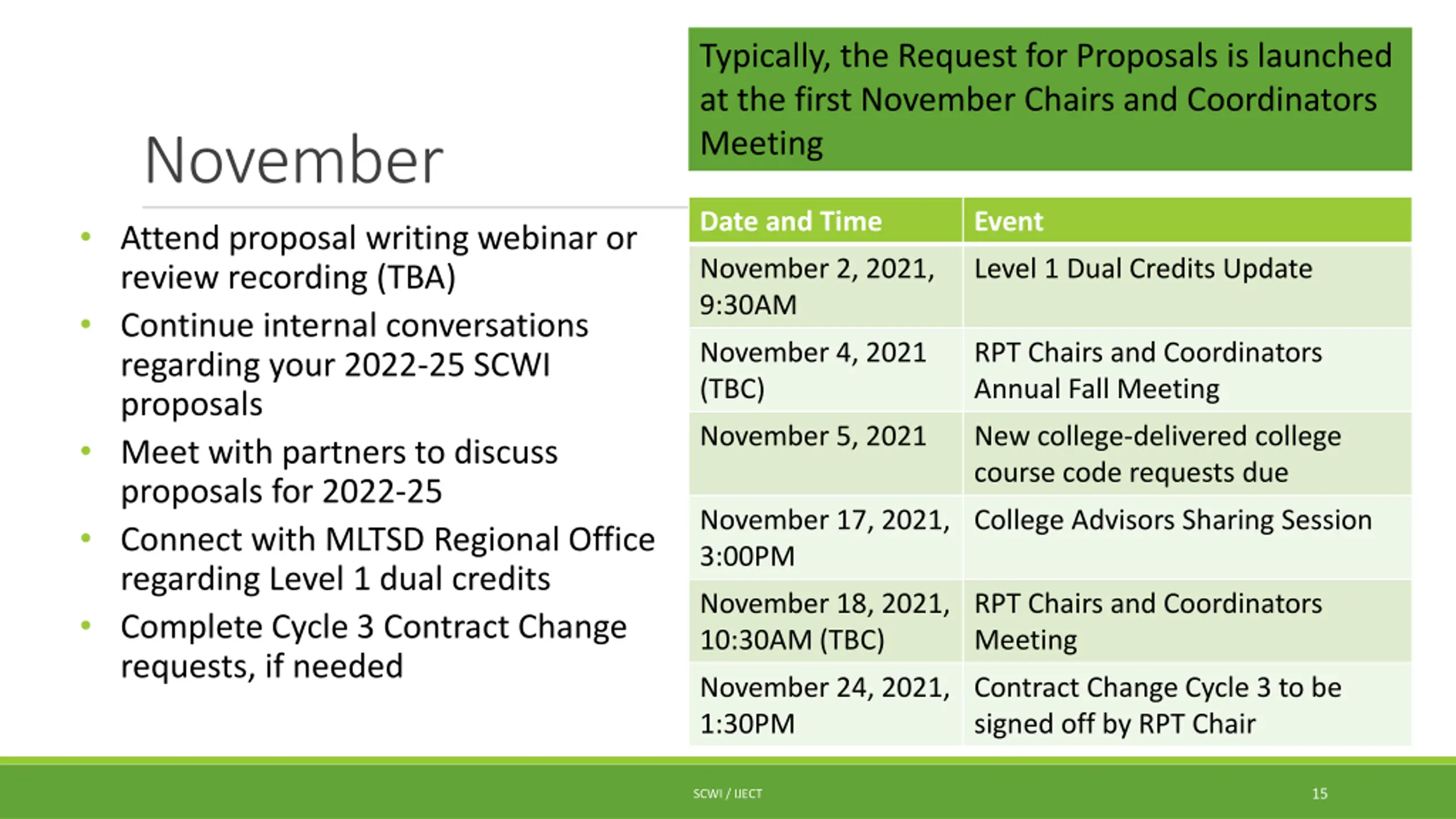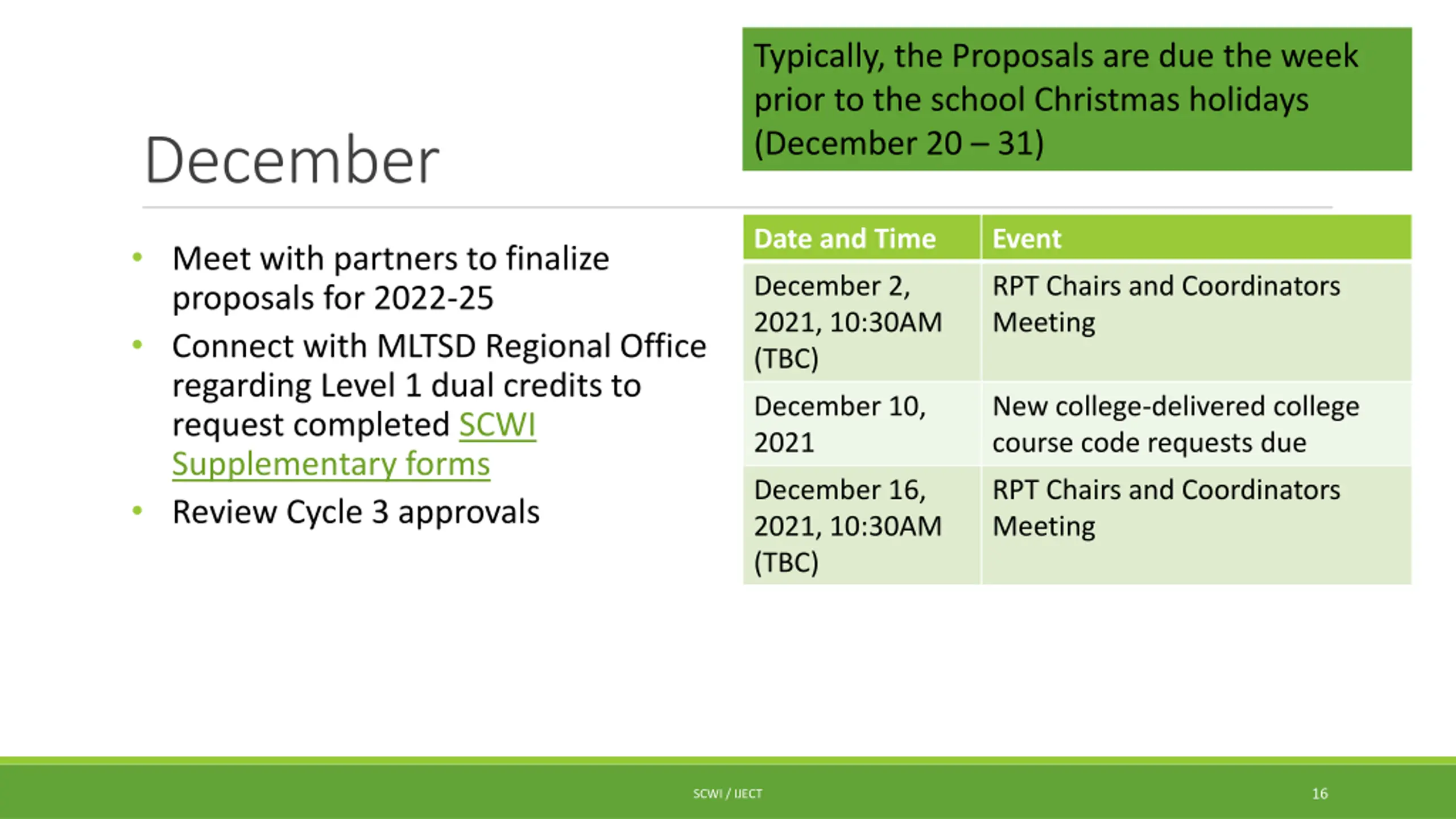 Typically, the Proposals are due the week prior to the school Christmas holidays (December 20 31) December Date and Time Event Meet with partners to finalize proposals for 2022-25 Connect with MLTSD Regional Office regarding Level 1 dual credits to request completed SCWI Supplementary forms Review Cycle 3 approvals December 2, 2021, 10:30AM (TBC) RPT Chairs and Coordinators Meeting December 10, 2021 New college-delivered college course code requests due December 16, 2021, 10:30AM (TBC) RPT Chairs and Coordinators Meeting 16 SCWI / IJECT