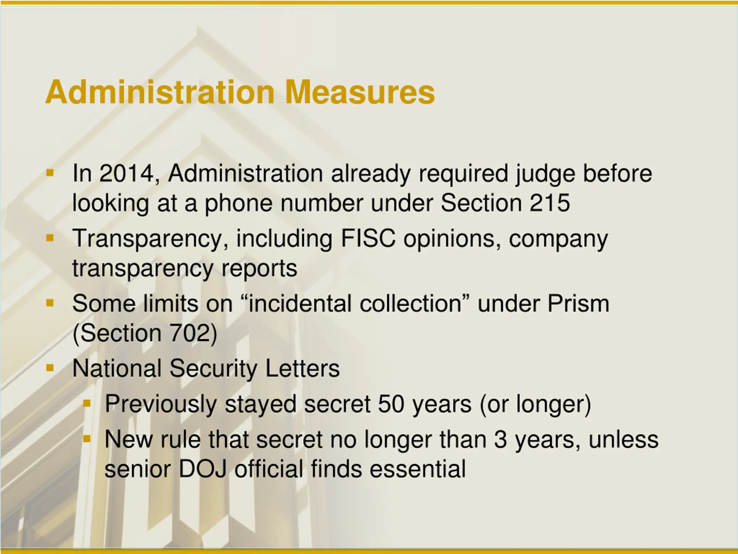 Administration Measures In 2014, Administration already required judge before looking at a phone number under Section 215 Transparency, including FISC opinions, company transparency reports Some limits on incidental collection under Prism (Section 702) National Security Letters Previously stayed secret 50 years (or longer) New rule that secret no longer than 3 years, unless senior DOJ official finds essential