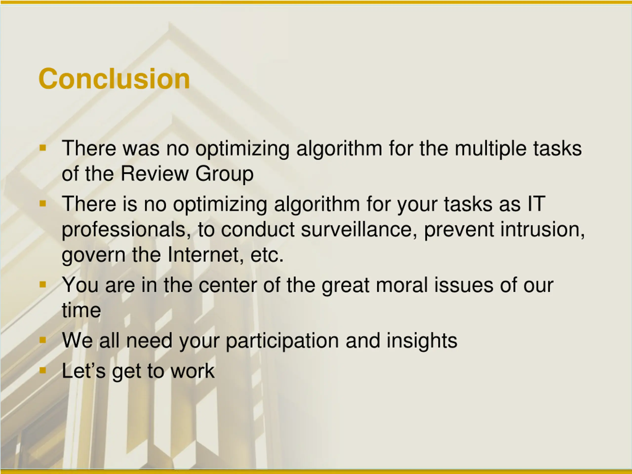 Conclusion There was no optimizing algorithm for the multiple tasks of the Review Group There is no optimizing algorithm for your tasks as IT professionals, to conduct surveillance, prevent intrusion, govern the Internet, etc. You are in the center of the great moral issues of our time We all need your participation and insights Let s get to work