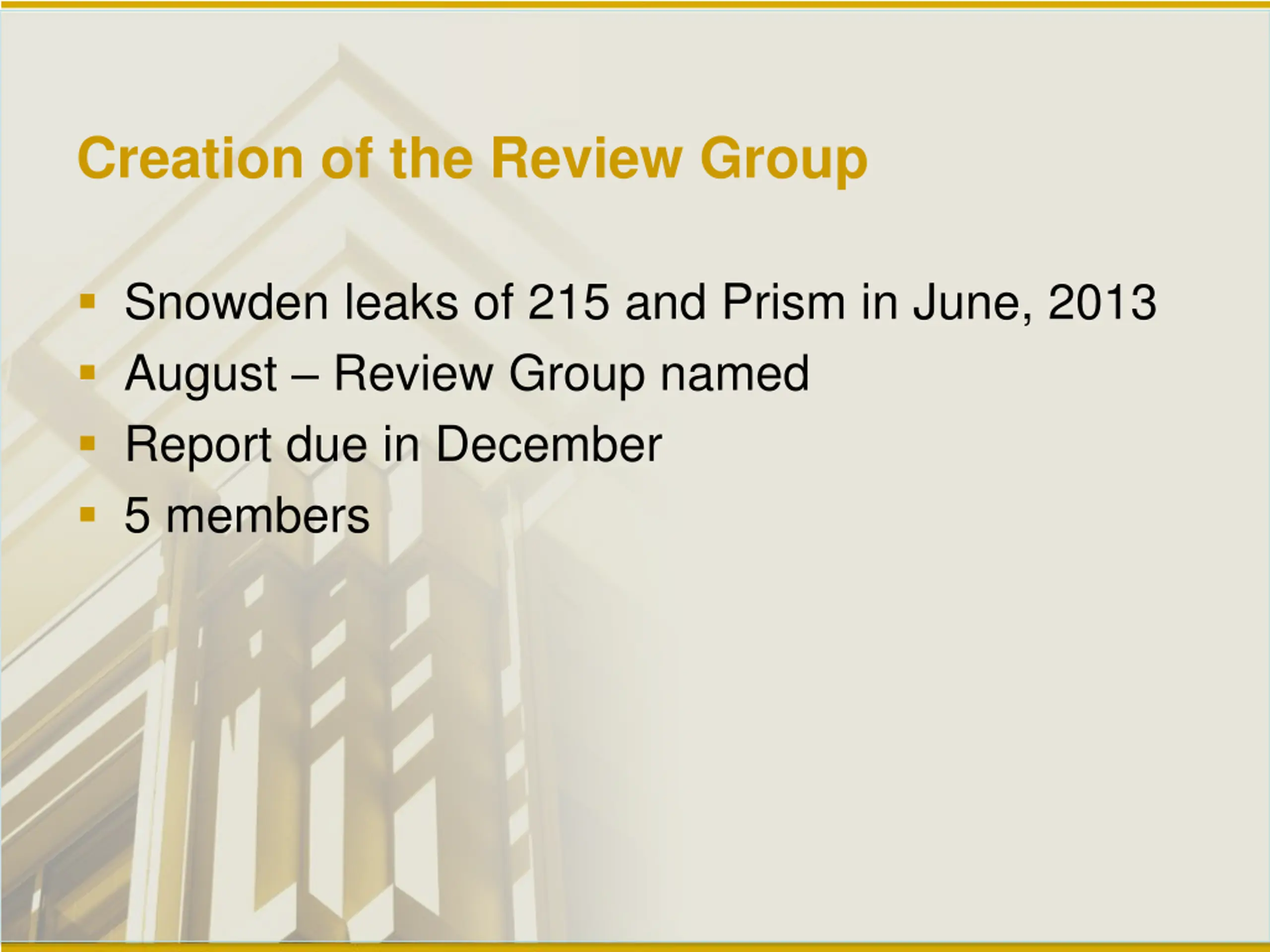 Creation of the Review Group Snowden leaks of 215 and Prism in June, 2013 August Review Group named Report due in December 5 members