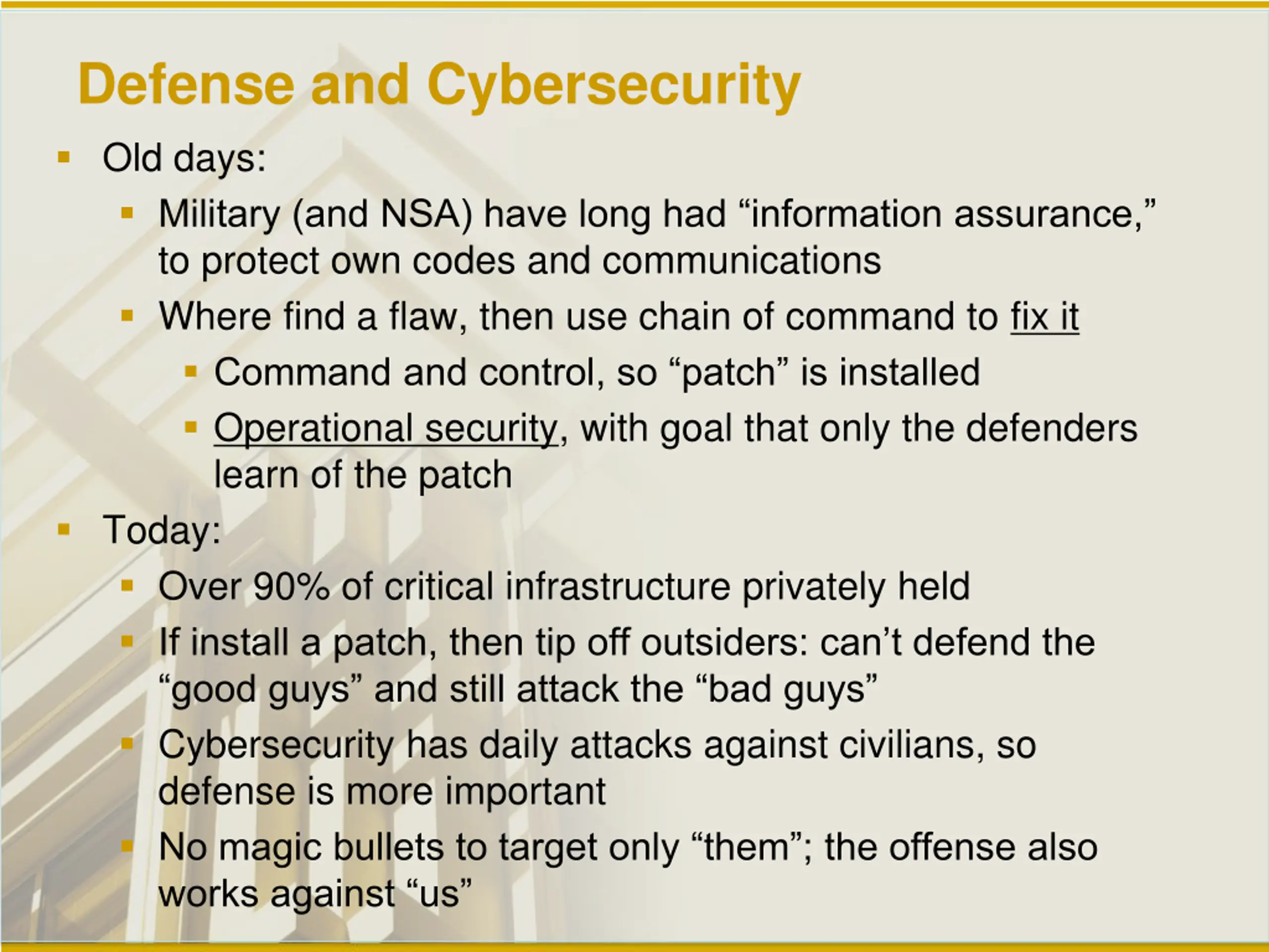 Defense and Cybersecurity Old days: Military (and NSA) have long had information assurance, to protect own codes and communications Where find a flaw, then use chain of command to fix it Command and control, so patch is installed Operational security, with goal that only the defenders learn of the patch Today: Over 90% of critical infrastructure privately held If install a patch, then tip off outsiders: can t defend the good guys and still attack the bad guys Cybersecurity has daily attacks against civilians, so defense is more important No magic bullets to target only them ; the offense also works against us