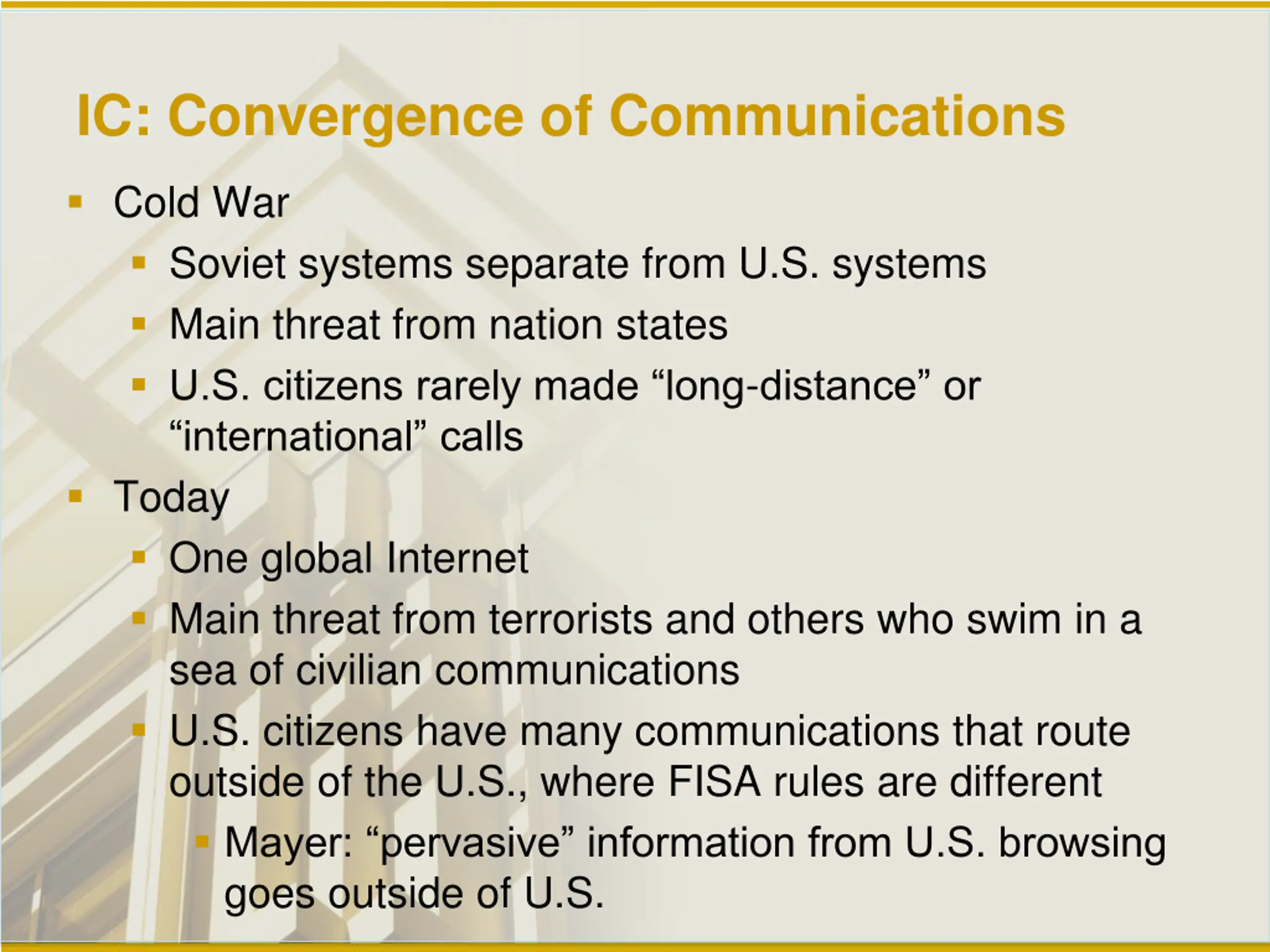 IC: Convergence of Communications Cold War Soviet systems separate from U.S. systems Main threat from nation states U.S. citizens rarely made long-distance or international calls Today One global Internet Main threat from terrorists and others who swim in a sea of civilian communications U.S. citizens have many communications that route outside of the U.S., where FISA rules are different Mayer: pervasive information from U.S. browsing goes outside of U.S.