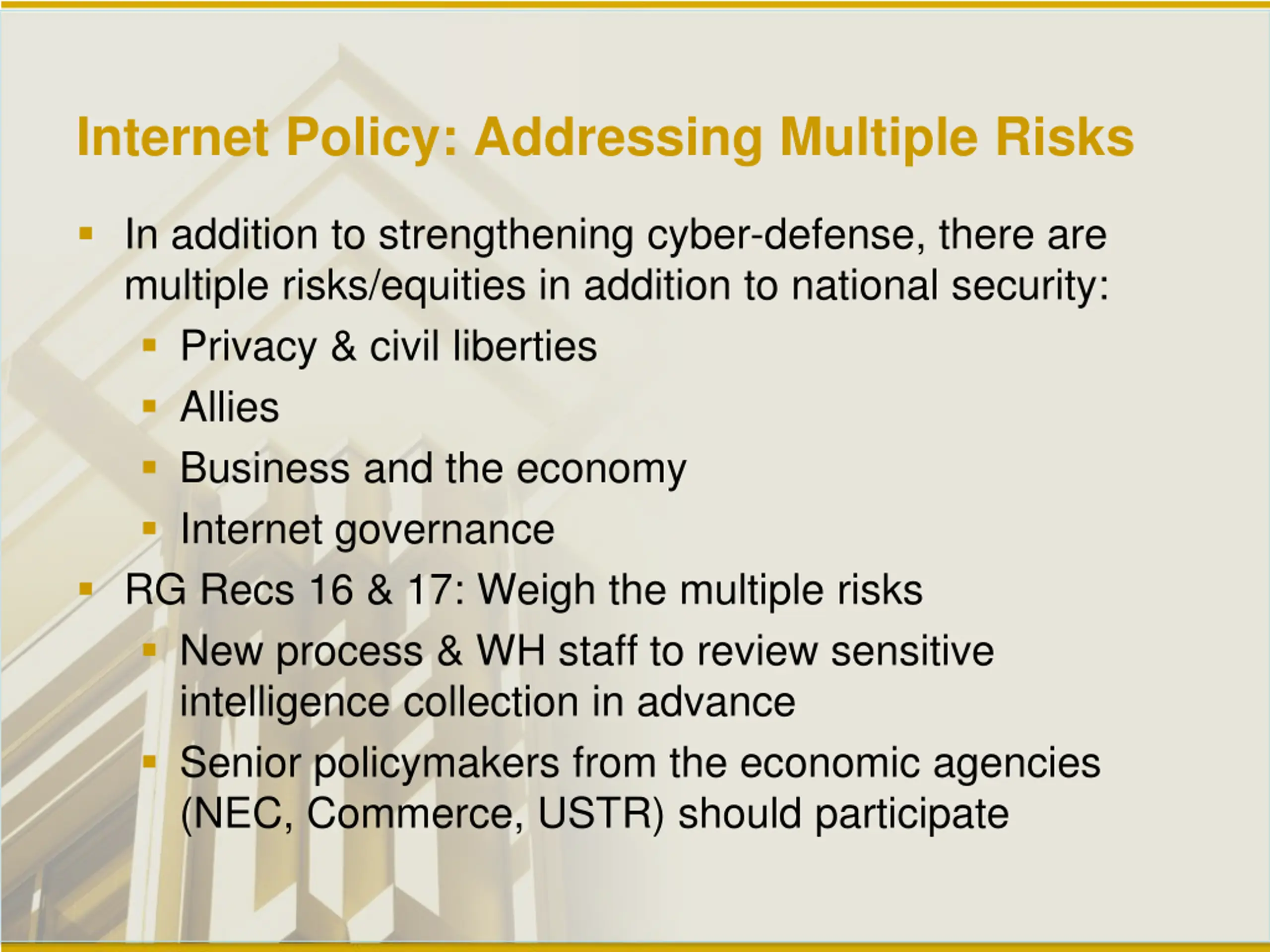 Internet Policy: Addressing Multiple Risks In addition to strengthening cyber-defense, there are multiple risks/equities in addition to national security: Privacy & civil liberties Allies Business and the economy Internet governance RG Recs 16 & 17: Weigh the multiple risks New process & WH staff to review sensitive intelligence collection in advance Senior policymakers from the economic agencies (NEC, Commerce, USTR) should participate