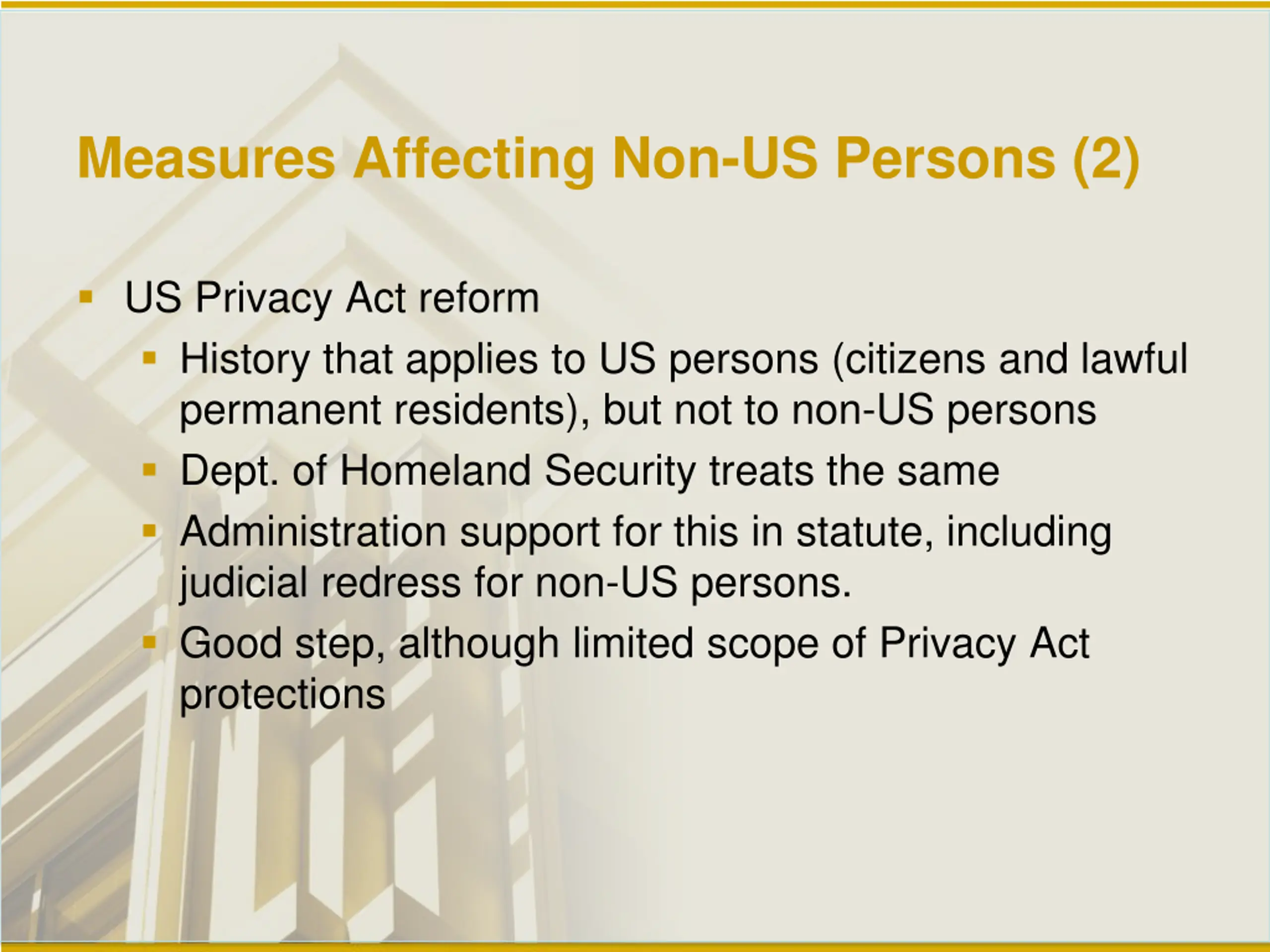Measures Affecting Non-US Persons (2) US Privacy Act reform History that applies to US persons (citizens and lawful permanent residents), but not to non-US persons Dept. of Homeland Security treats the same Administration support for this in statute, including judicial redress for non-US persons. Good step, although limited scope of Privacy Act protections