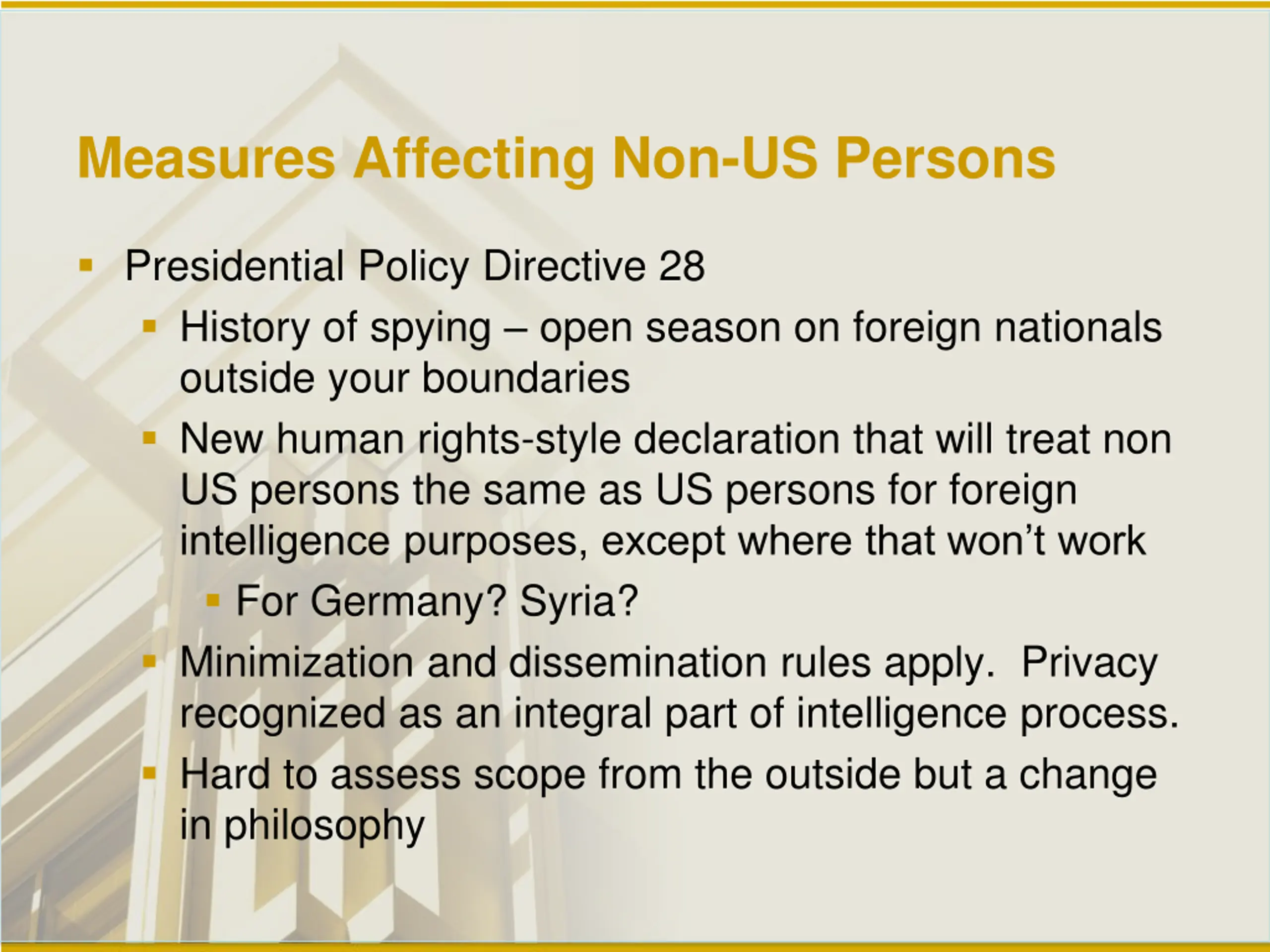 Measures Affecting Non-US Persons Presidential Policy Directive 28 History of spying open season on foreign nationals outside your boundaries New human rights-style declaration that will treat non US persons the same as US persons for foreign intelligence purposes, except where that won t work For Germany? Syria? Minimization and dissemination rules apply. Privacy recognized as an integral part of intelligence process. Hard to assess scope from the outside but a change in philosophy