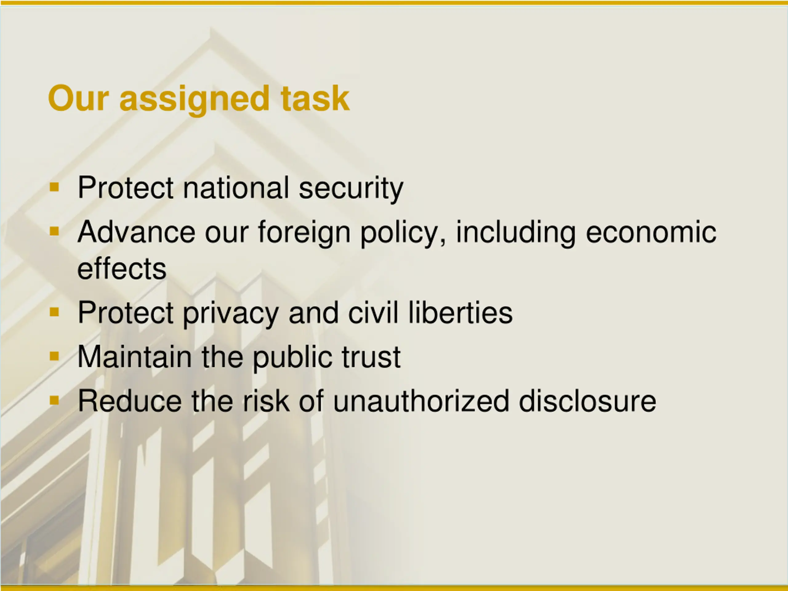 Our assigned task Protect national security Advance our foreign policy, including economic effects Protect privacy and civil liberties Maintain the public trust Reduce the risk of unauthorized disclosure