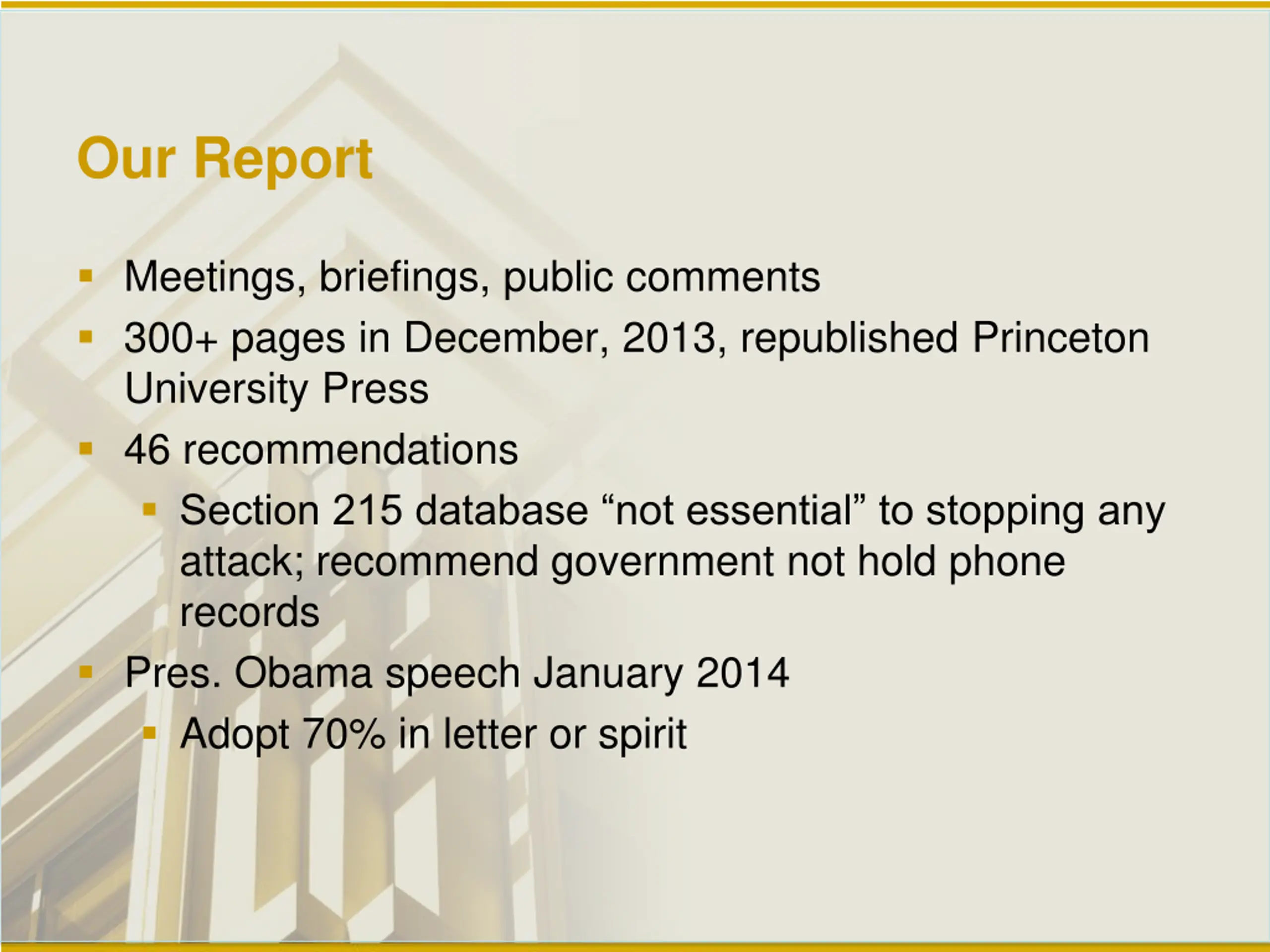 Our Report Meetings, briefings, public comments 300+ pages in December, 2013, republished Princeton University Press 46 recommendations Section 215 database not essential to stopping any attack; recommend government not hold phone records Pres. Obama speech January 2014 Adopt 70% in letter or spirit