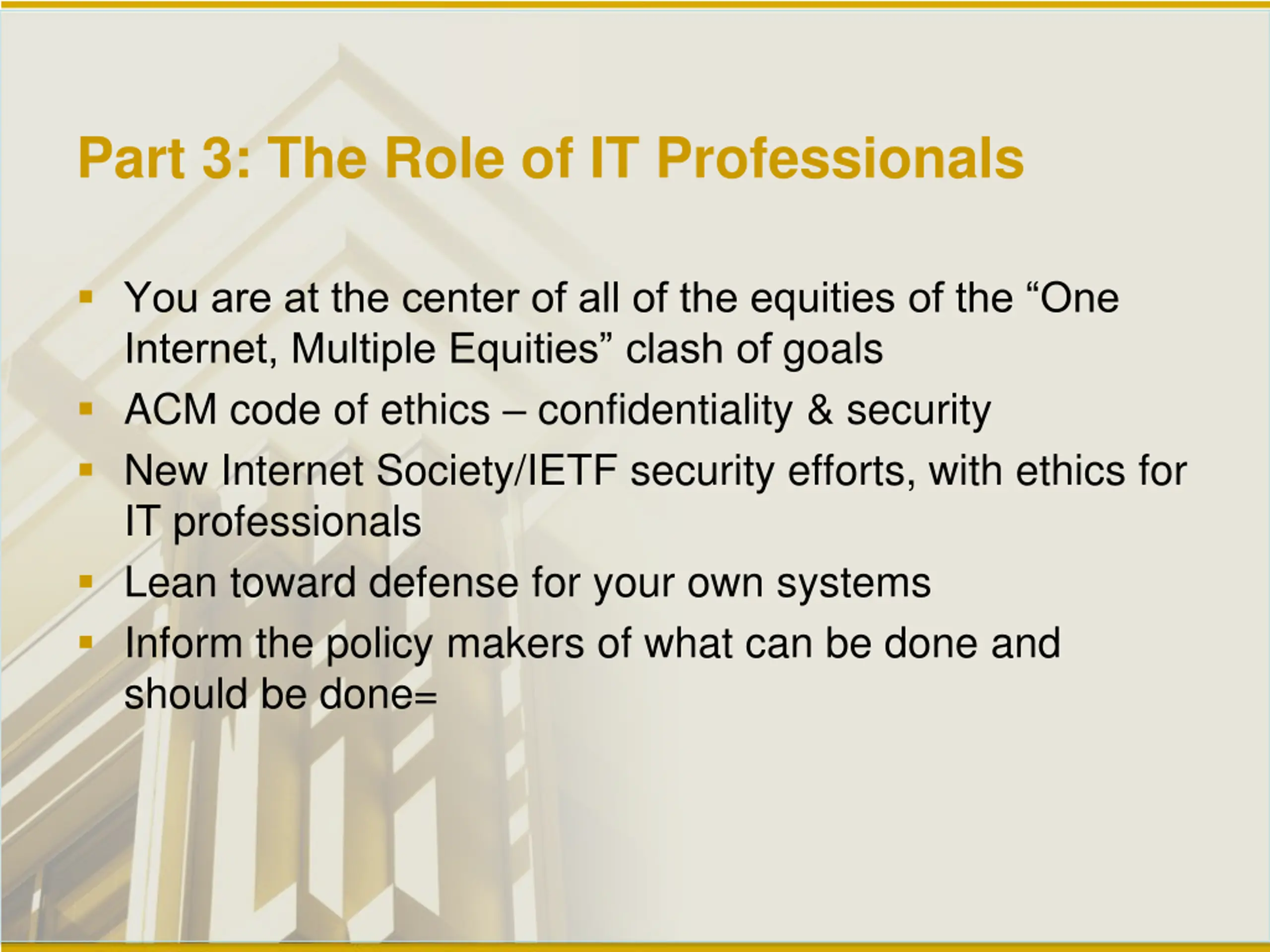 Part 3: The Role of IT Professionals You are at the center of all of the equities of the One Internet, Multiple Equities clash of goals ACM code of ethics confidentiality & security New Internet Society/IETF security efforts, with ethics for IT professionals Lean toward defense for your own systems Inform the policy makers of what can be done and should be done=