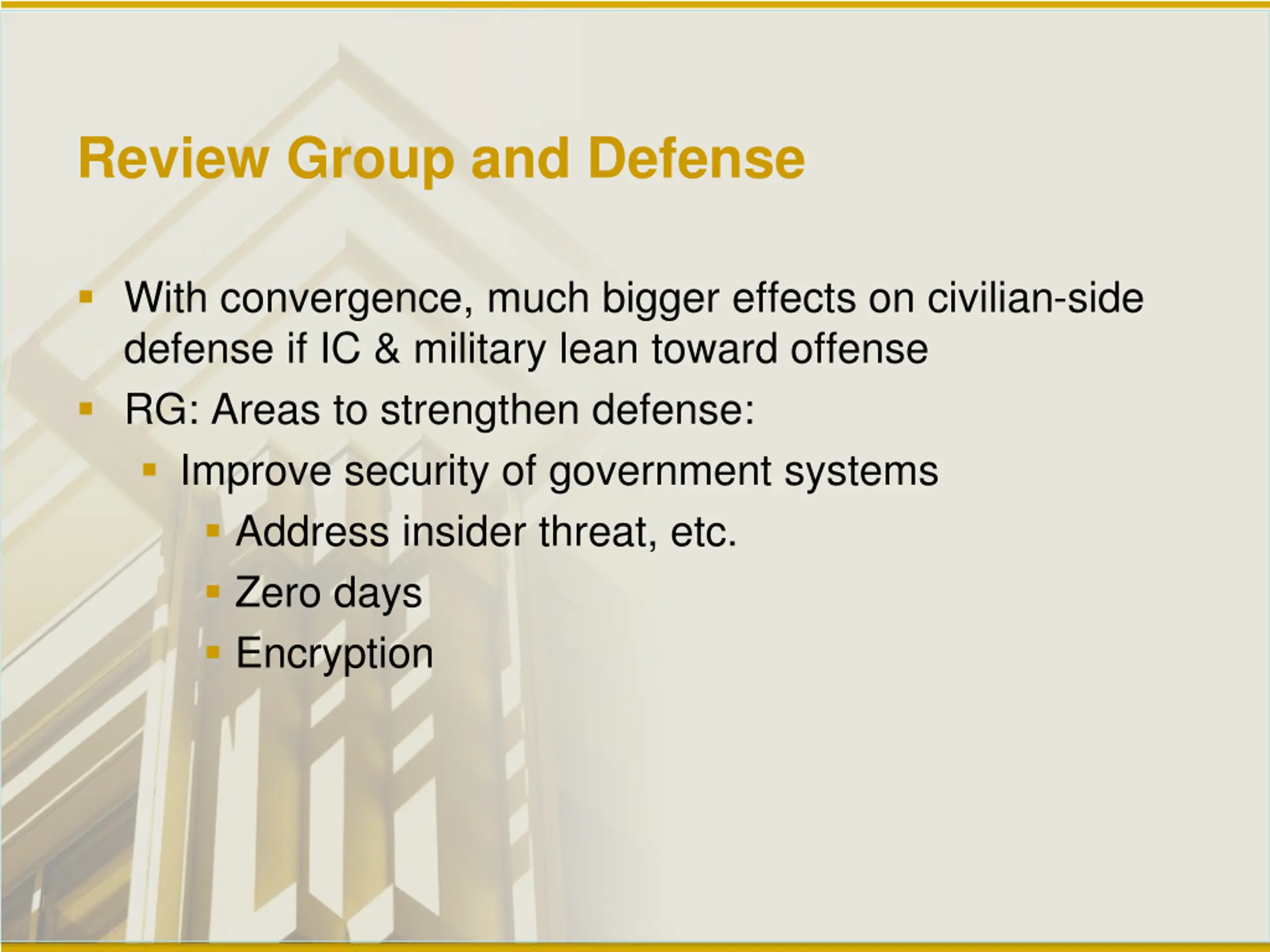 Review Group and Defense With convergence, much bigger effects on civilian-side defense if IC & military lean toward offense RG: Areas to strengthen defense: Improve security of government systems Address insider threat, etc. Zero days Encryption