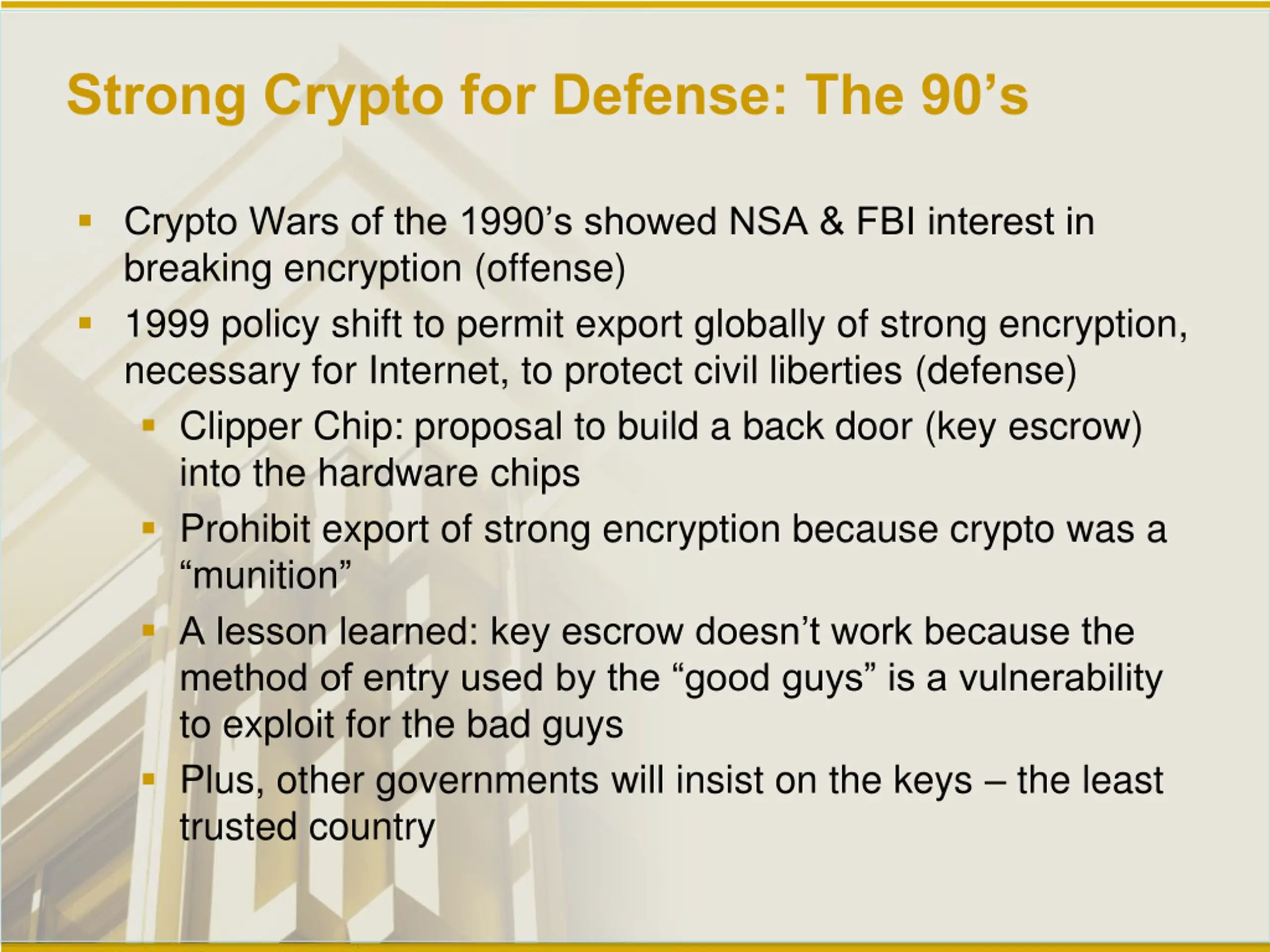 Strong Crypto for Defense: The 90s Crypto Wars of the 1990 s showed NSA & FBI interest in breaking encryption (offense) 1999 policy shift to permit export globally of strong encryption, necessary for Internet, to protect civil liberties (defense) Clipper Chip: proposal to build a back door (key escrow) into the hardware chips Prohibit export of strong encryption because crypto was a munition A lesson learned: key escrow doesn t work because the method of entry used by the good guys is a vulnerability to exploit for the bad guys Plus, other governments will insist on the keys the least trusted country