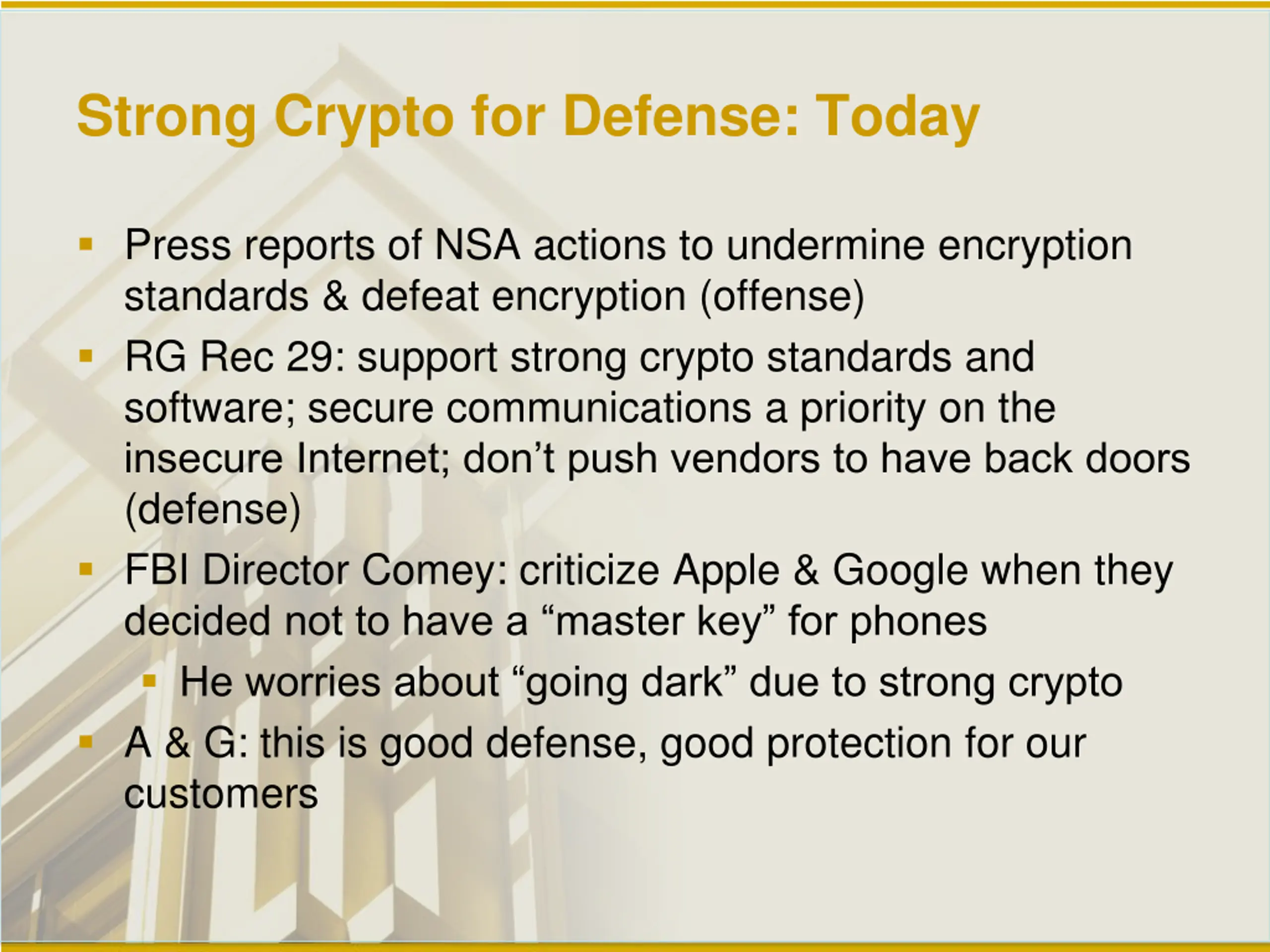 Strong Crypto for Defense: Today Press reports of NSA actions to undermine encryption standards & defeat encryption (offense) RG Rec 29: support strong crypto standards and software; secure communications a priority on the insecure Internet; don t push vendors to have back doors (defense) FBI Director Comey: criticize Apple & Google when they decided not to have a master key for phones He worries about going dark due to strong crypto A & G: this is good defense, good protection for our customers