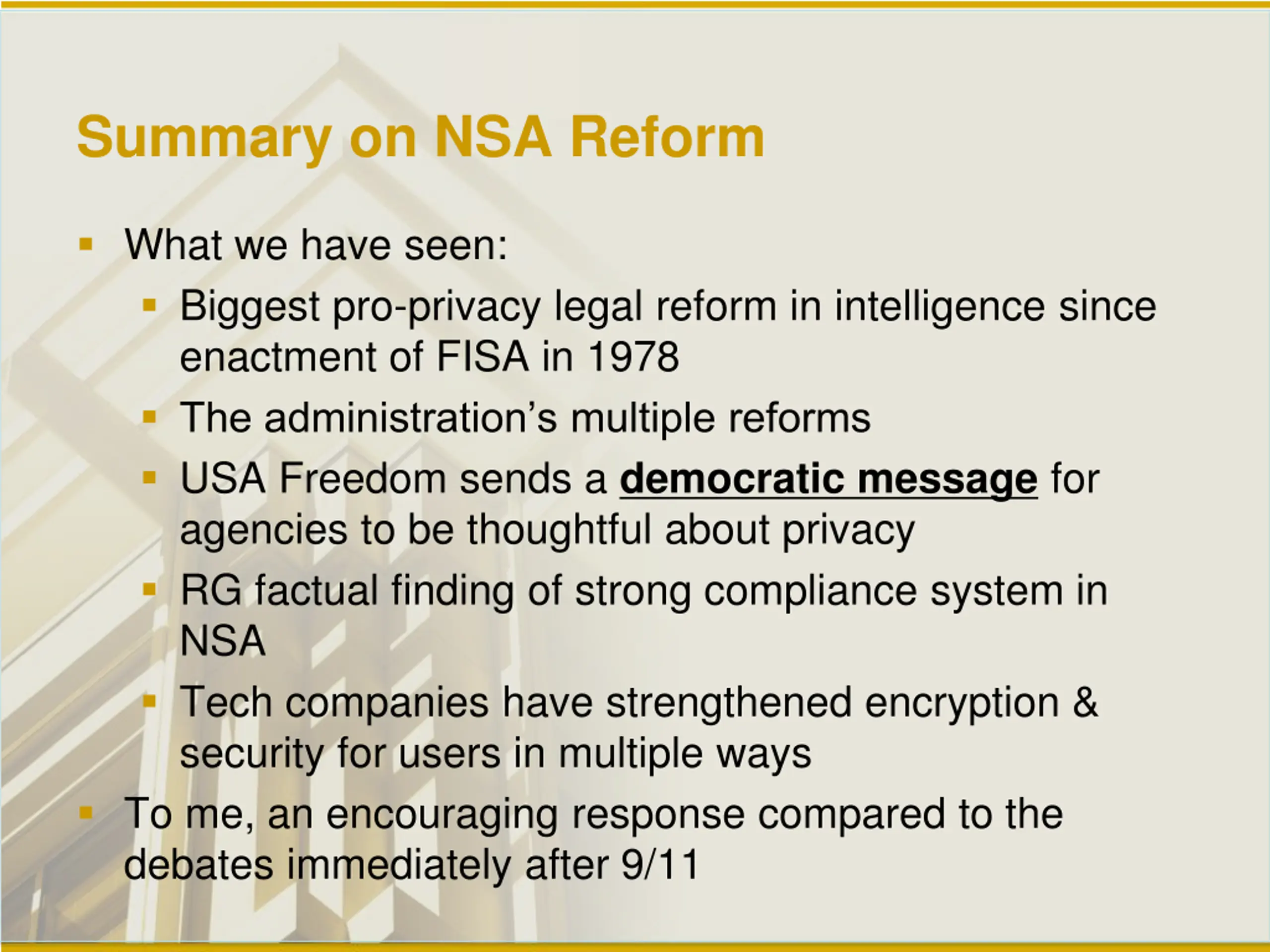 Summary on NSA Reform What we have seen: Biggest pro-privacy legal reform in intelligence since enactment of FISA in 1978 The administration s multiple reforms USA Freedom sends a democratic message for agencies to be thoughtful about privacy RG factual finding of strong compliance system in NSA Tech companies have strengthened encryption & security for users in multiple ways To me, an encouraging response compared to the debates immediately after 9/11
