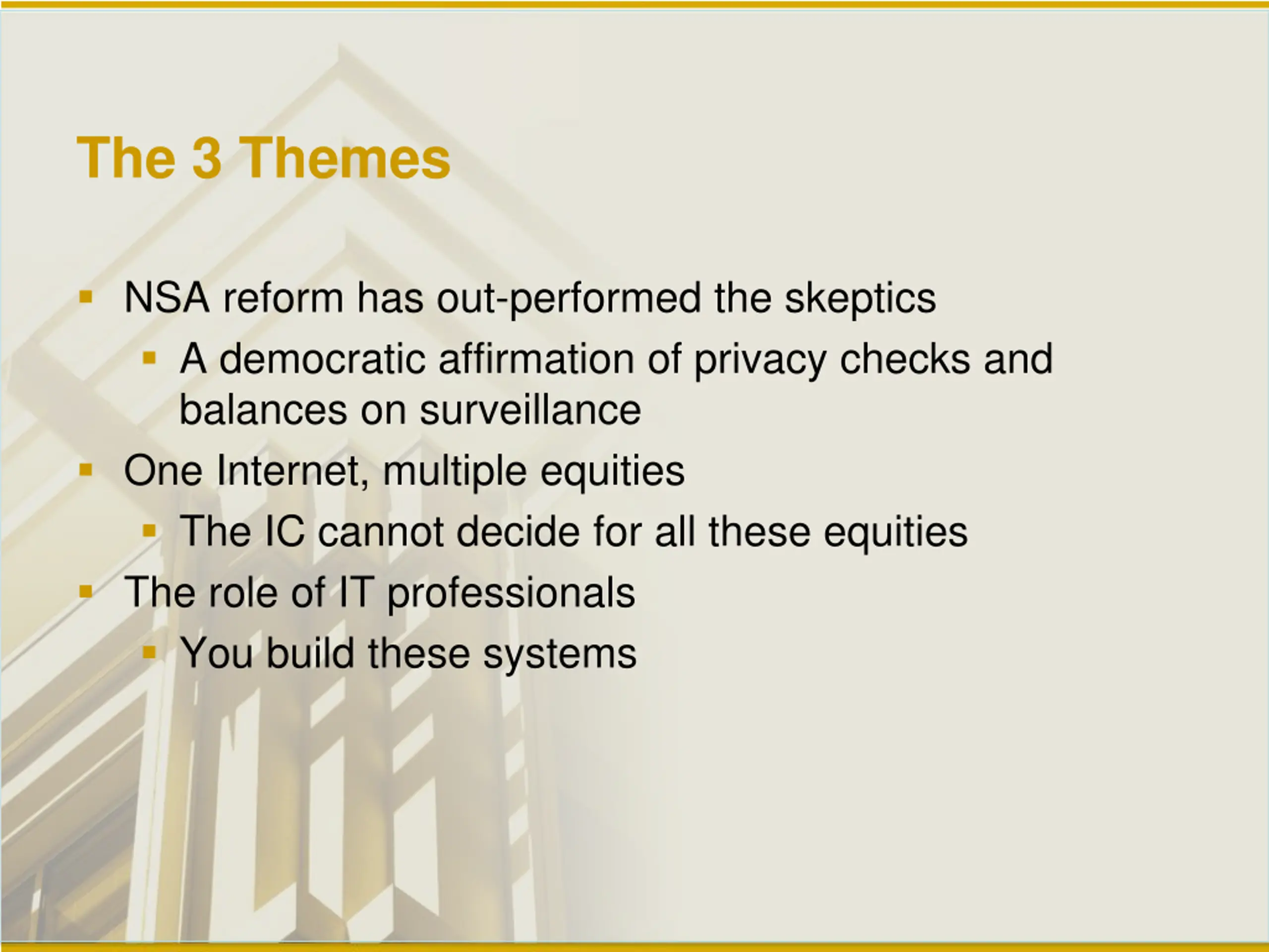 The 3 Themes NSA reform has out-performed the skeptics A democratic affirmation of privacy checks and balances on surveillance One Internet, multiple equities The IC cannot decide for all these equities The role of IT professionals You build these systems