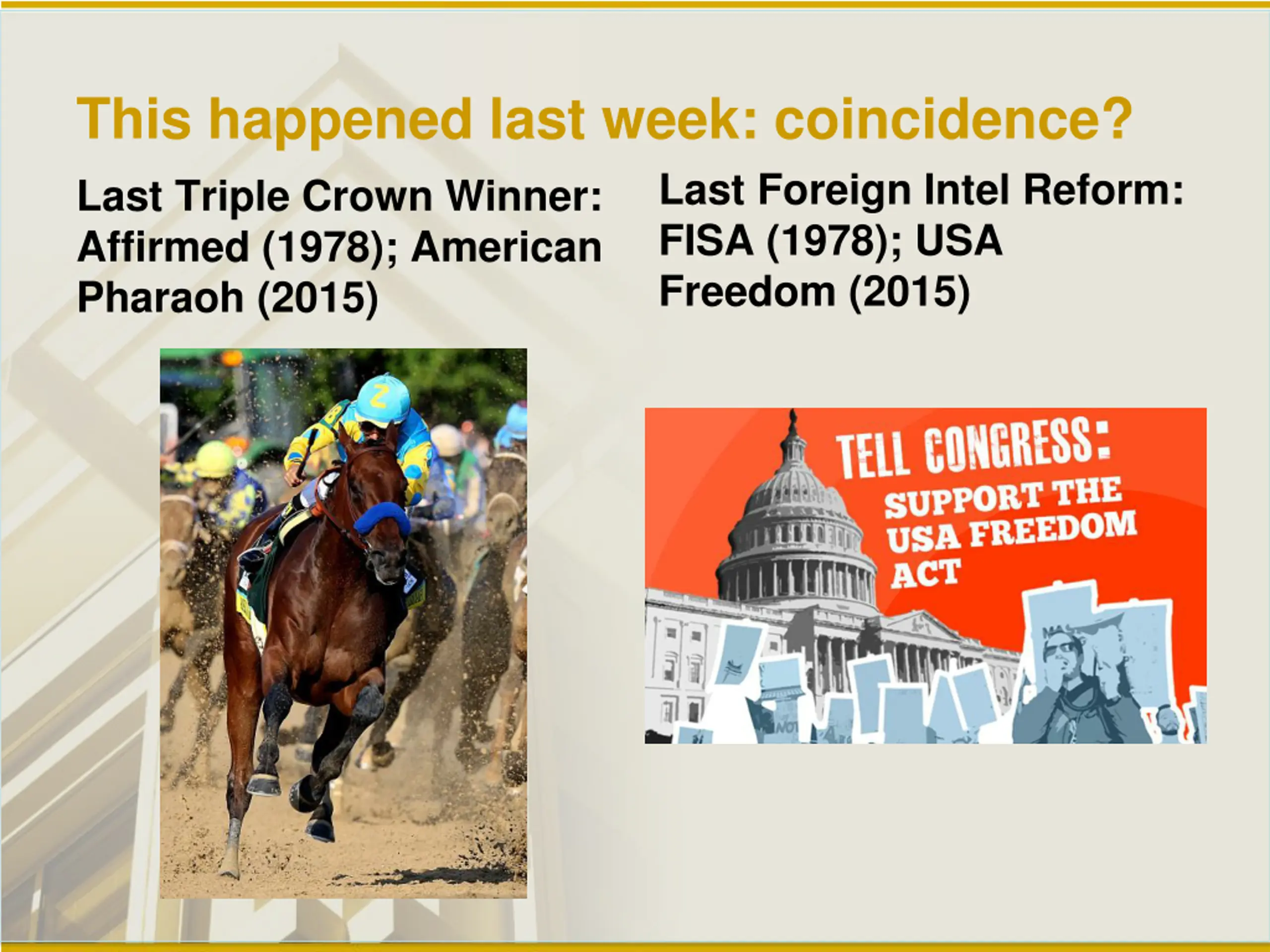 This happened last week: coincidence? Last Triple Crown Winner: Affirmed (1978); American Pharaoh (2015) Last Foreign Intel Reform: FISA (1978); USA Freedom (2015)