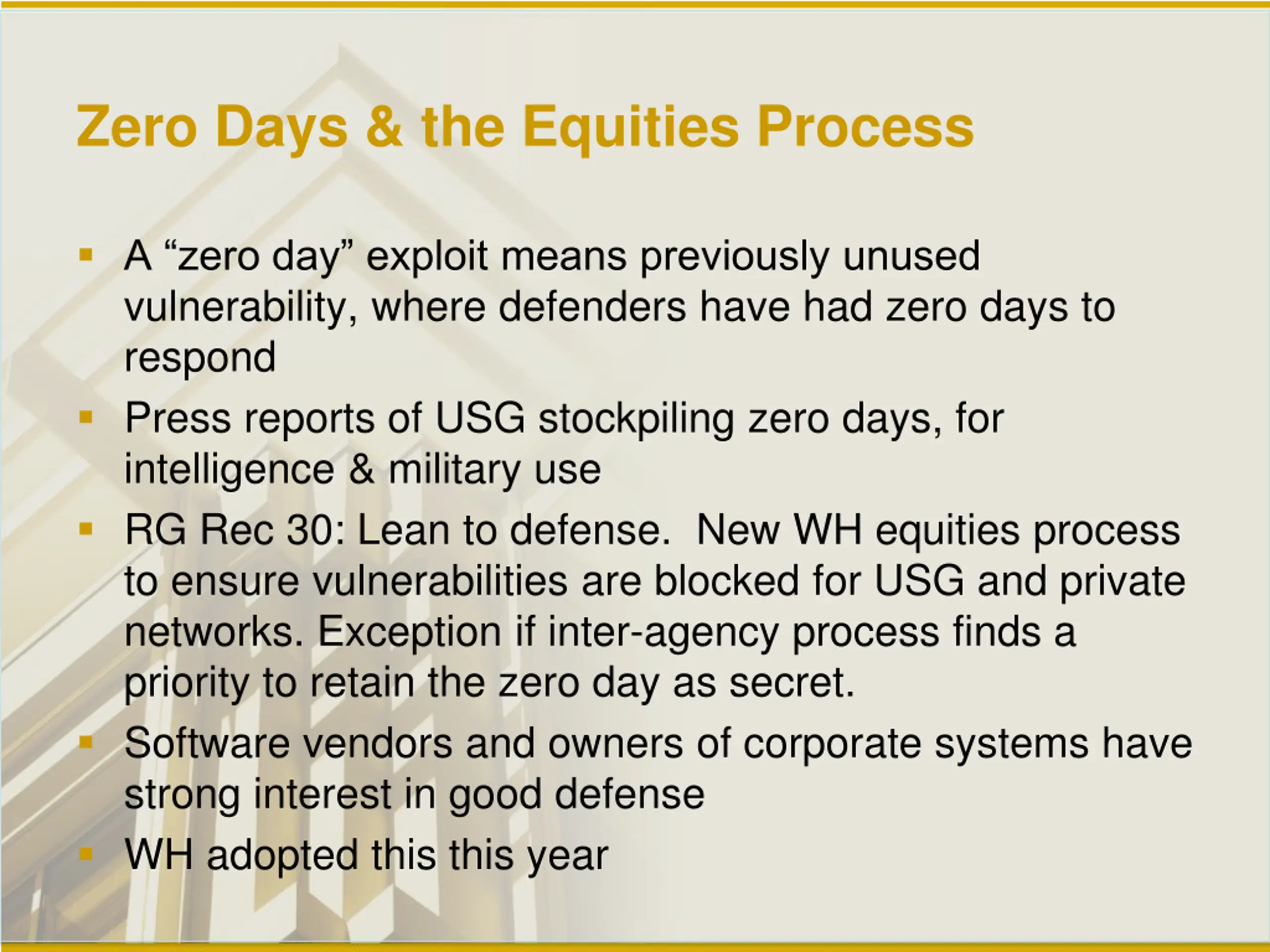 Zero Days & the Equities Process A zero day exploit means previously unused vulnerability, where defenders have had zero days to respond Press reports of USG stockpiling zero days, for intelligence & military use RG Rec 30: Lean to defense. New WH equities process to ensure vulnerabilities are blocked for USG and private networks. Exception if inter-agency process finds a priority to retain the zero day as secret. Software vendors and owners of corporate systems have strong interest in good defense WH adopted this this year