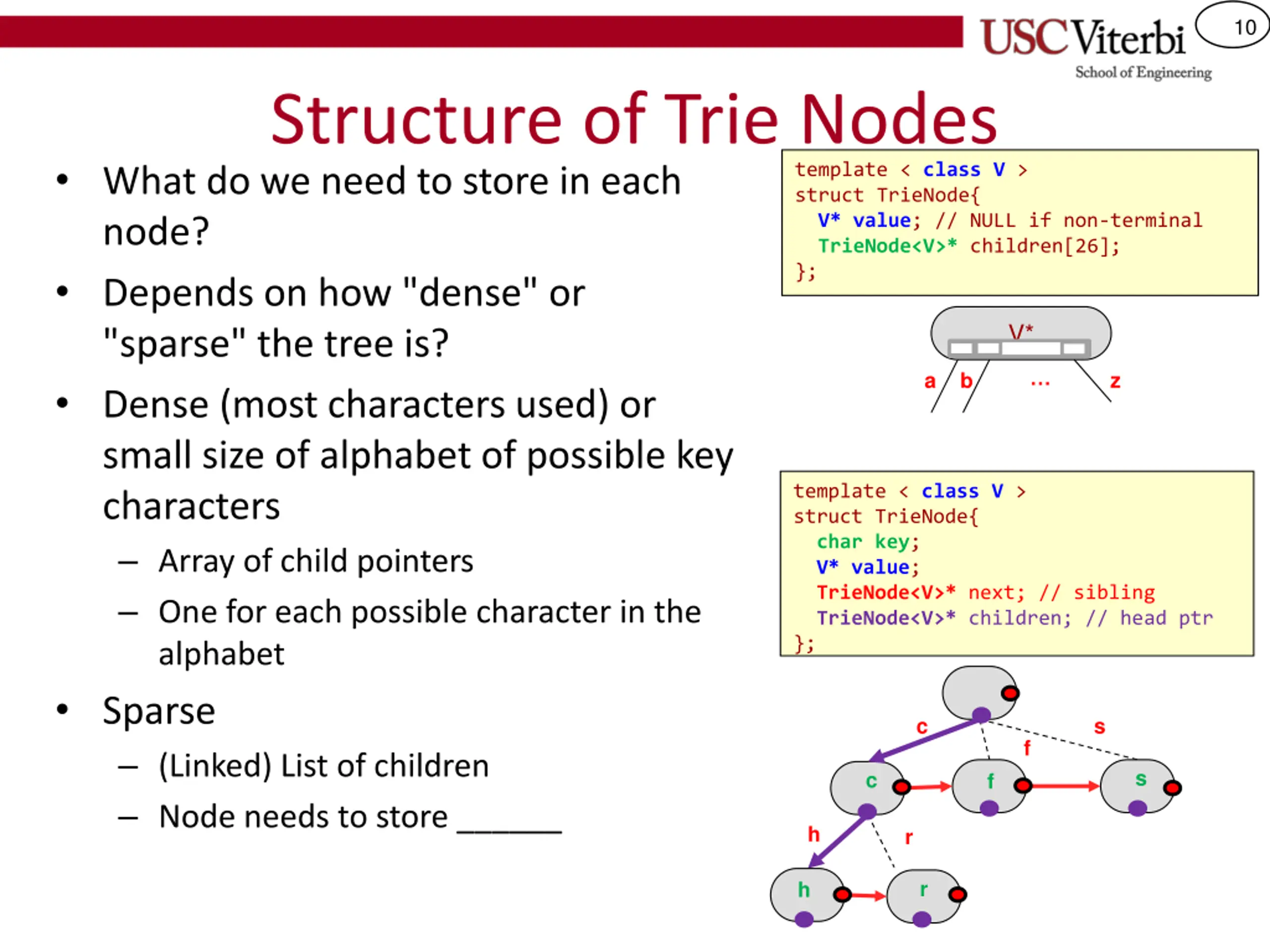 10 Structure of Trie Nodes What do we need to store in each node? Depends on how "dense" or "sparse" the tree is? Dense (most characters used) or small size of alphabet of possible key characters Array of child pointers One for each possible character in the alphabet Sparse (Linked) List of children Node needs to store ______ template < class V > struct TrieNode{ V* value; // NULL if non-terminal TrieNode<V>* children[26]; }; V* a b z template < class V > struct TrieNode{ char key; V* value; TrieNode<V>* next; // sibling TrieNode<V>* children; // head ptr }; c s f s c f h r r h