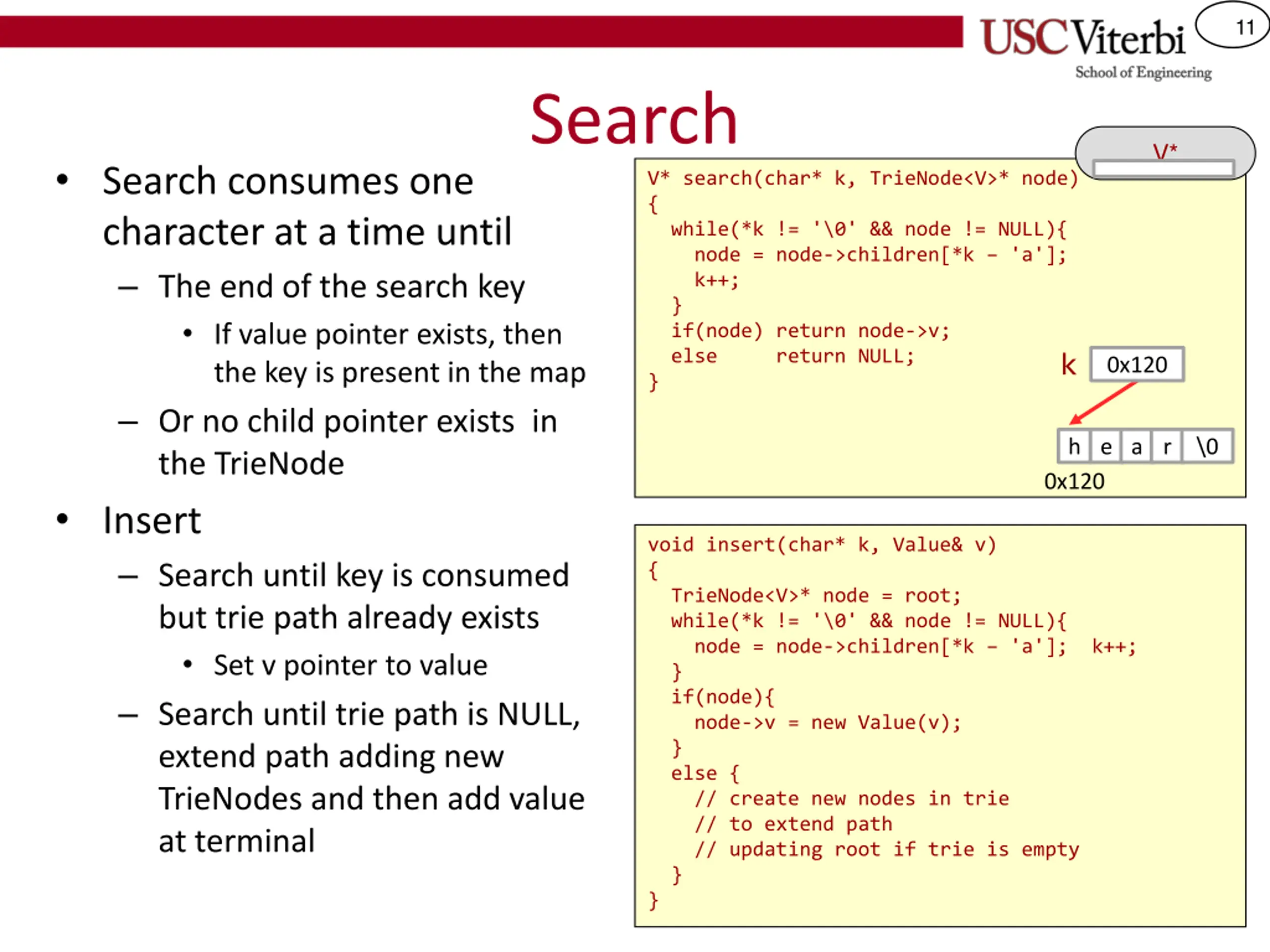 11 Search V* Search consumes one character at a time until The end of the search key If value pointer exists, then the key is present in the map Or no child pointer exists in the TrieNode Insert Search until key is consumed but trie path already exists Set v pointer to value Search until trie path is NULL, extend path adding new TrieNodes and then add value at terminal V* search(char* k, TrieNode<V>* node) { while(*k != '\0' && node != NULL){ node = node->children[*k 'a']; k++; } if(node) return node->v; else return NULL; } k 0x120 h e a r 0x120 \0 void insert(char* k, Value& v) { TrieNode<V>* node = root; while(*k != '\0' && node != NULL){ node = node->children[*k 'a']; k++; } if(node){ node->v = new Value(v); } else { // create new nodes in trie // to extend path // updating root if trie is empty } }