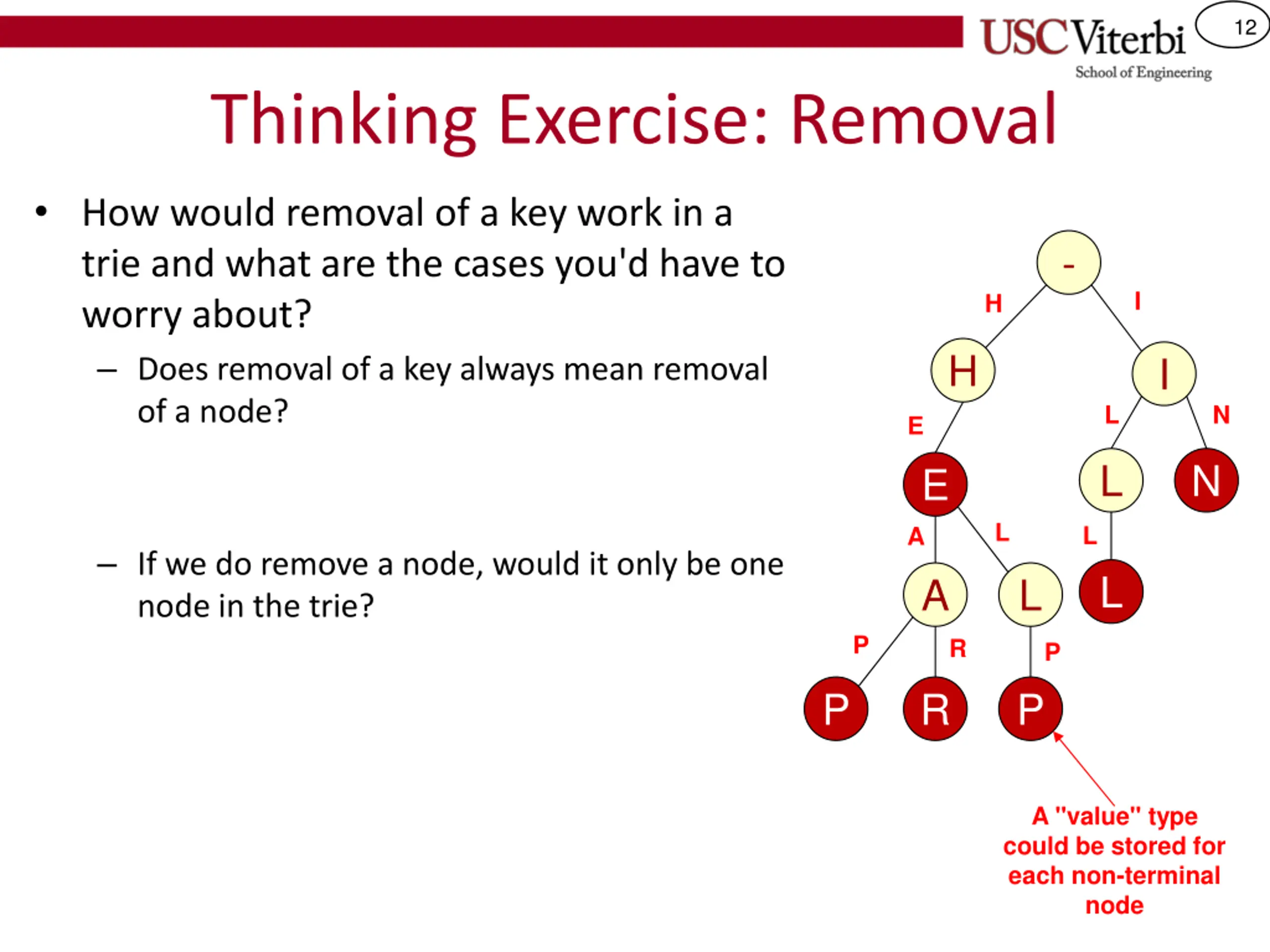 12 Thinking Exercise: Removal How would removal of a key work in a trie and what are the cases you'd have to worry about? Does removal of a key always mean removal of a node? - I H H I L N E L N E L L A If we do remove a node, would it only be one node in the trie? L A L P R P P R P A "value" type could be stored for each non-terminal node