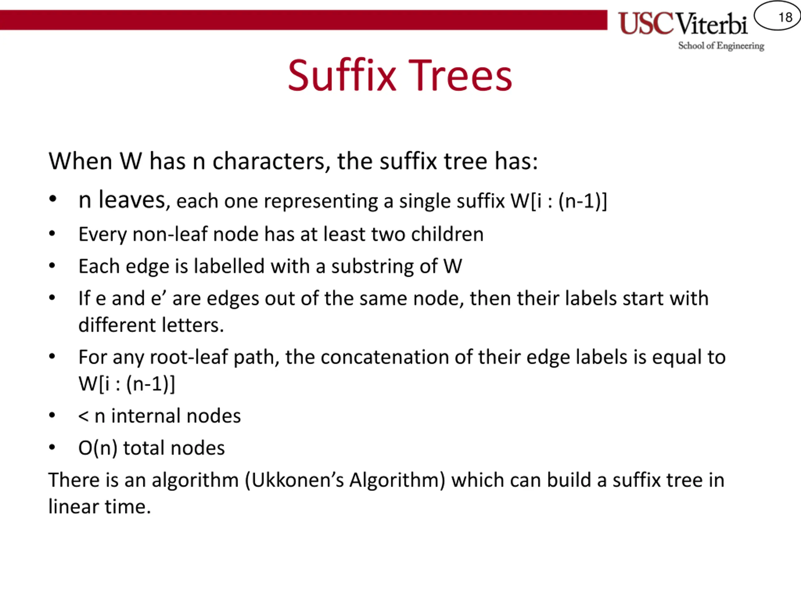 18 Suffix Trees When W has n characters, the suffix tree has: n leaves, each one representing a single suffix W[i : (n-1)] Every non-leaf node has at least two children Each edge is labelled with a substring of W If e and e are edges out of the same node, then their labels start with different letters. For any root-leaf path, the concatenation of their edge labels is equal to W[i : (n-1)] < n internal nodes O(n) total nodes There is an algorithm (Ukkonen s Algorithm) which can build a suffix tree in linear time.