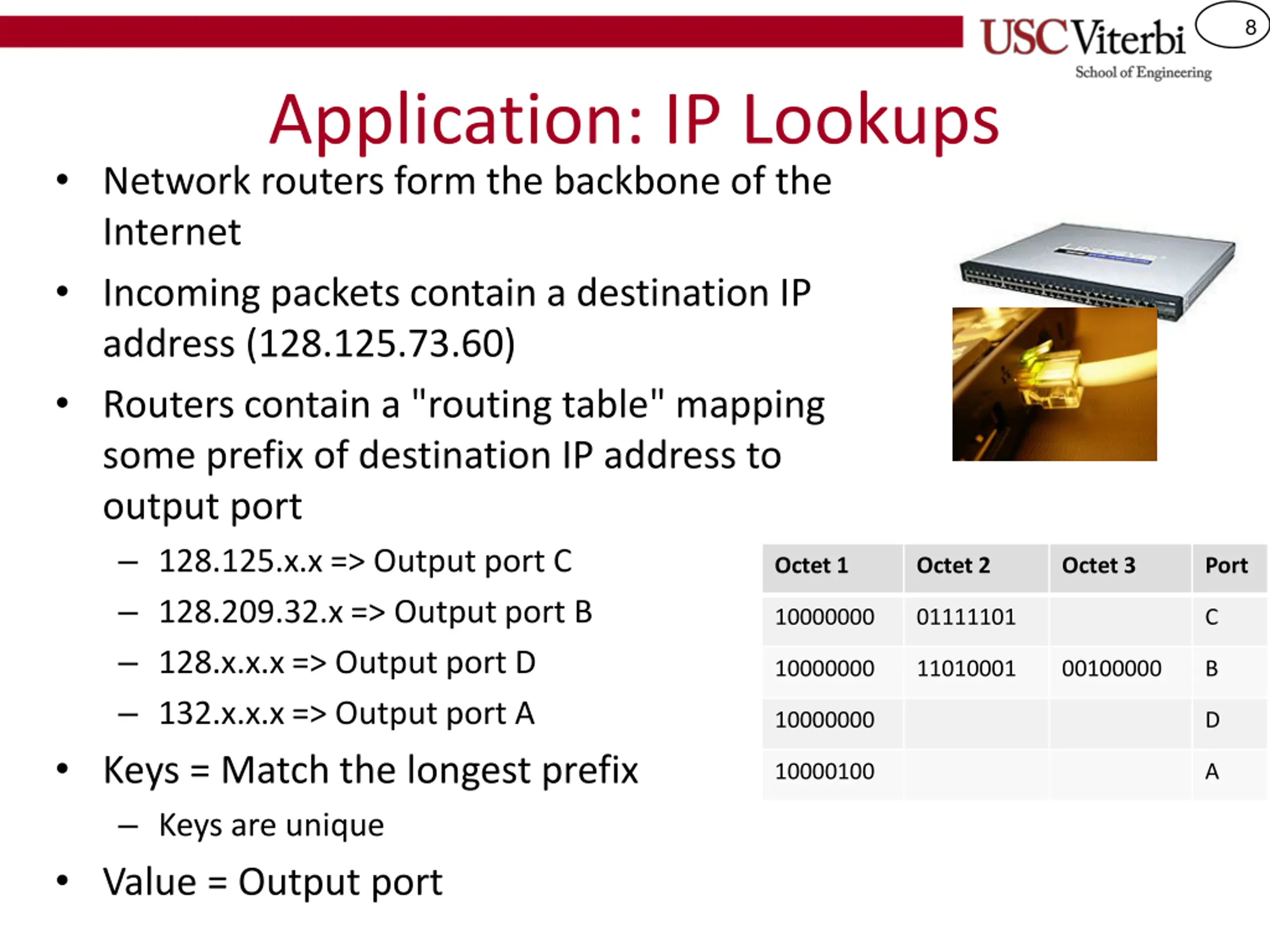 8 Application: IP Lookups Network routers form the backbone of the Internet Incoming packets contain a destination IP address (128.125.73.60) Routers contain a "routing table" mapping some prefix of destination IP address to output port 128.125.x.x => Output port C 128.209.32.x => Output port B 128.x.x.x => Output port D 132.x.x.x => Output port A Keys = Match the longest prefix Keys are unique Value = Output port Octet 1 Octet 2 Octet 3 Port 10000000 01111101 C 10000000 11010001 00100000 B 10000000 D 10000100 A