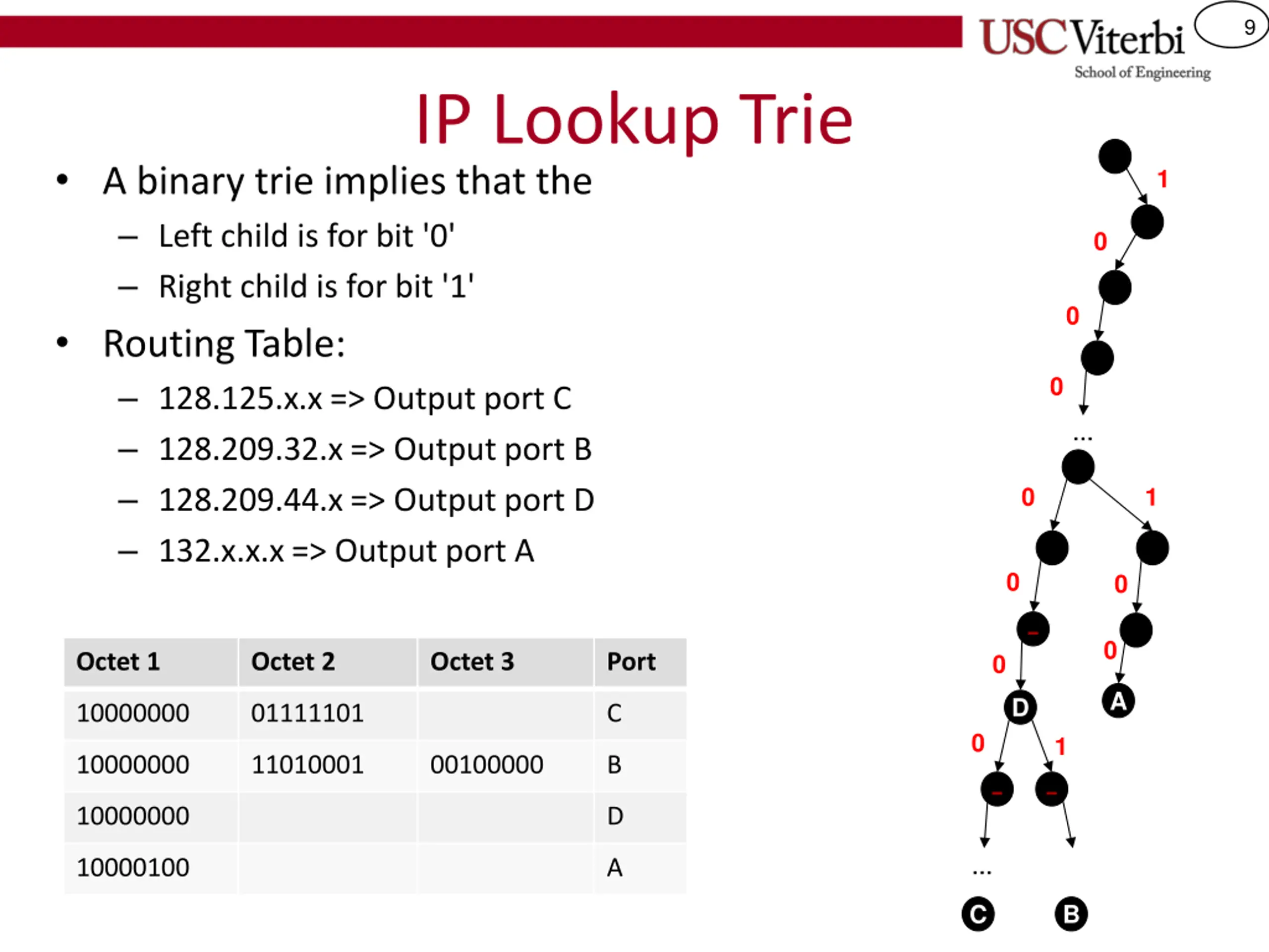 9 IP Lookup Trie A binary trie implies that the Left child is for bit '0' Right child is for bit '1' Routing Table: 128.125.x.x => Output port C 128.209.32.x => Output port B 128.209.44.x => Output port D 132.x.x.x => Output port A 1 0 0 0 0 1 0 0 - 0 Octet 1 Octet 2 Octet 3 Port 0 A D 10000000 01111101 C 0 1 10000000 11010001 00100000 B - - 10000000 D 10000100 A C B