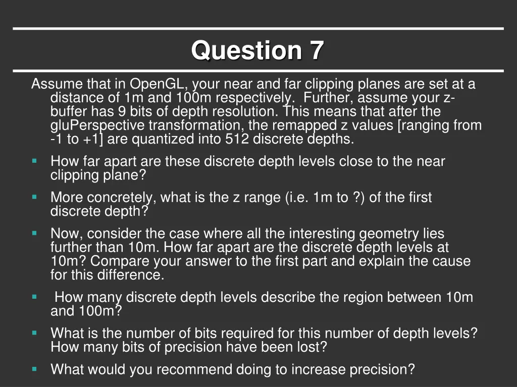 Question 7 Assume that in OpenGL, your near and far clipping planes are set at a distance of 1m and 100m respectively. Further, assume your z- buffer has 9 bits of depth resolution. This means that after the gluPerspective transformation, the remapped z values [ranging from -1 to +1] are quantized into 512 discrete depths. How far apart are these discrete depth levels close to the near clipping plane? More concretely, what is the z range (i.e. 1m to ?) of the first discrete depth? Now, consider the case where all the interesting geometry lies further than 10m. How far apart are the discrete depth levels at 10m? Compare your answer to the first part and explain the cause for this difference. How many discrete depth levels describe the region between 10m and 100m? What is the number of bits required for this number of depth levels? How many bits of precision have been lost? What would you recommend doing to increase precision?