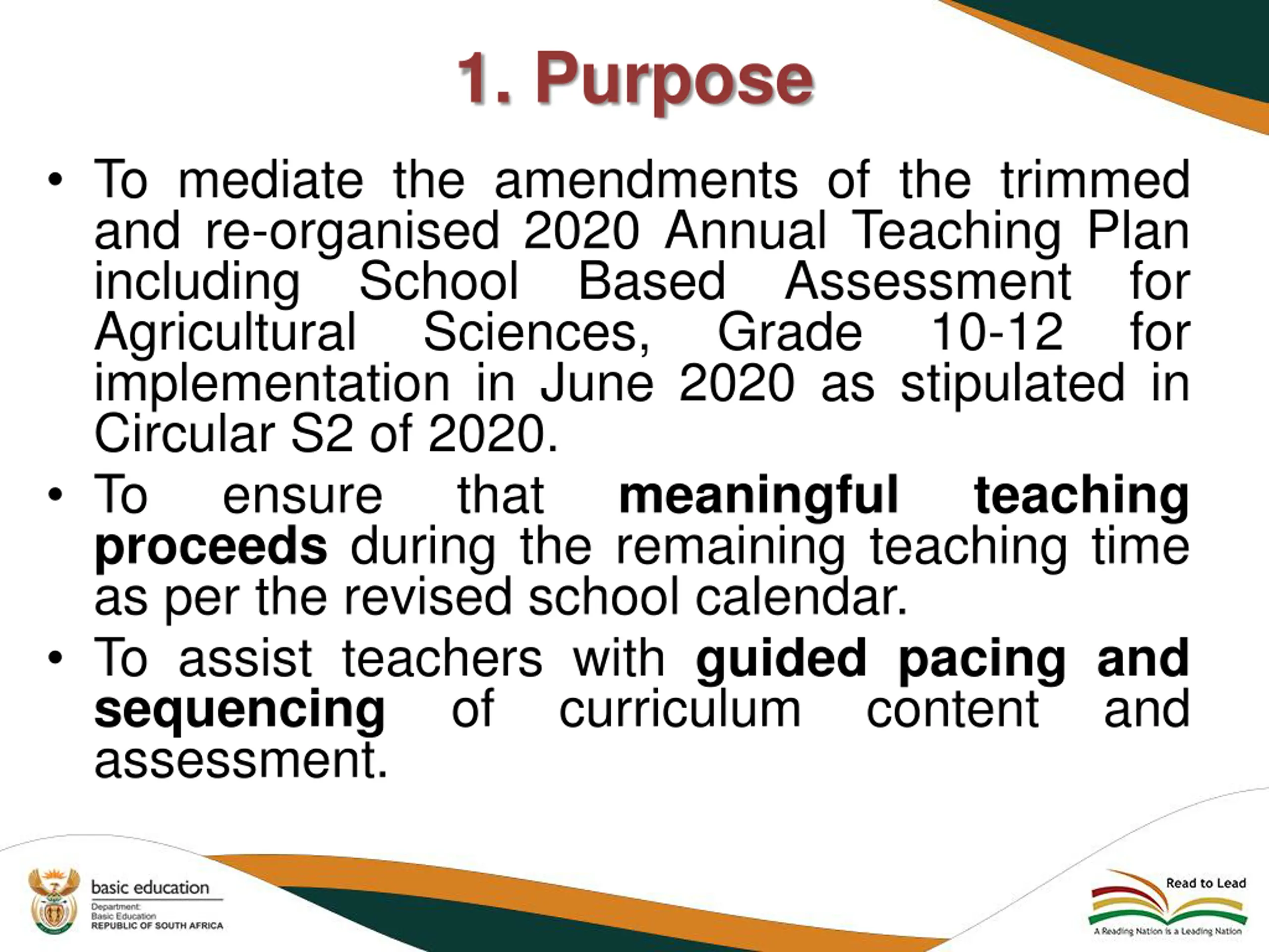 1. Purpose To mediate the amendments of the trimmed and re-organised 2020 Annual Teaching Plan including School Based Agricultural Sciences, implementation in June 2020 as stipulated in Circular S2 of 2020. To ensure that meaningful proceeds during the remaining teaching time as per the revised school calendar. To assist teachers with guided pacing and sequencing of curriculum assessment. Assessment Grade for for 10-12 teaching content and