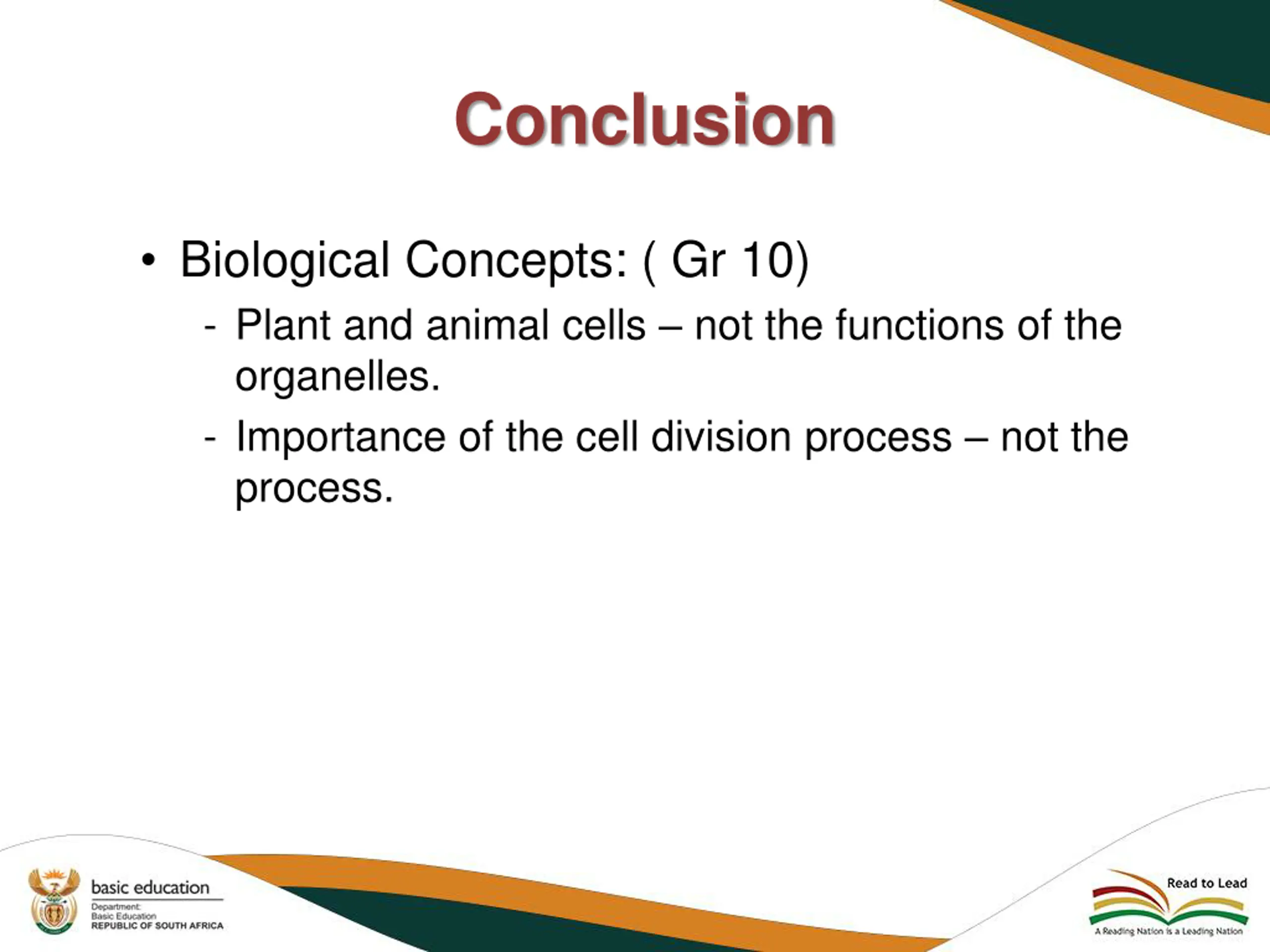 Conclusion Biological Concepts: ( Gr 10) - Plant and animal cells not the functions of the organelles. - Importance of the cell division process not the process.