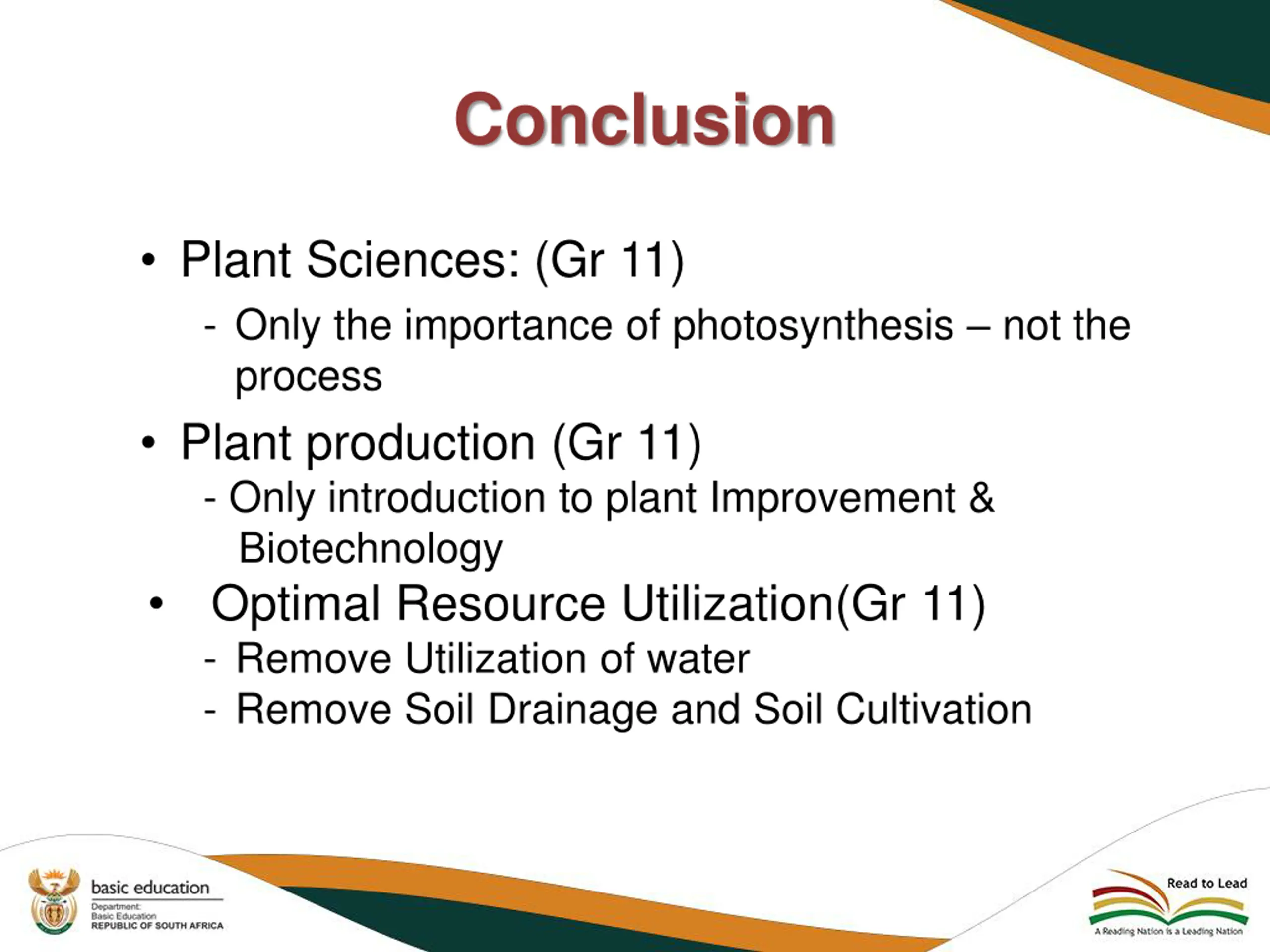 Conclusion Plant Sciences: (Gr 11) - Only the importance of photosynthesis not the process Plant production (Gr 11) - Only introduction to plant Improvement & Biotechnology Optimal Resource Utilization(Gr 11) - Remove Utilization of water - Remove Soil Drainage and Soil Cultivation
