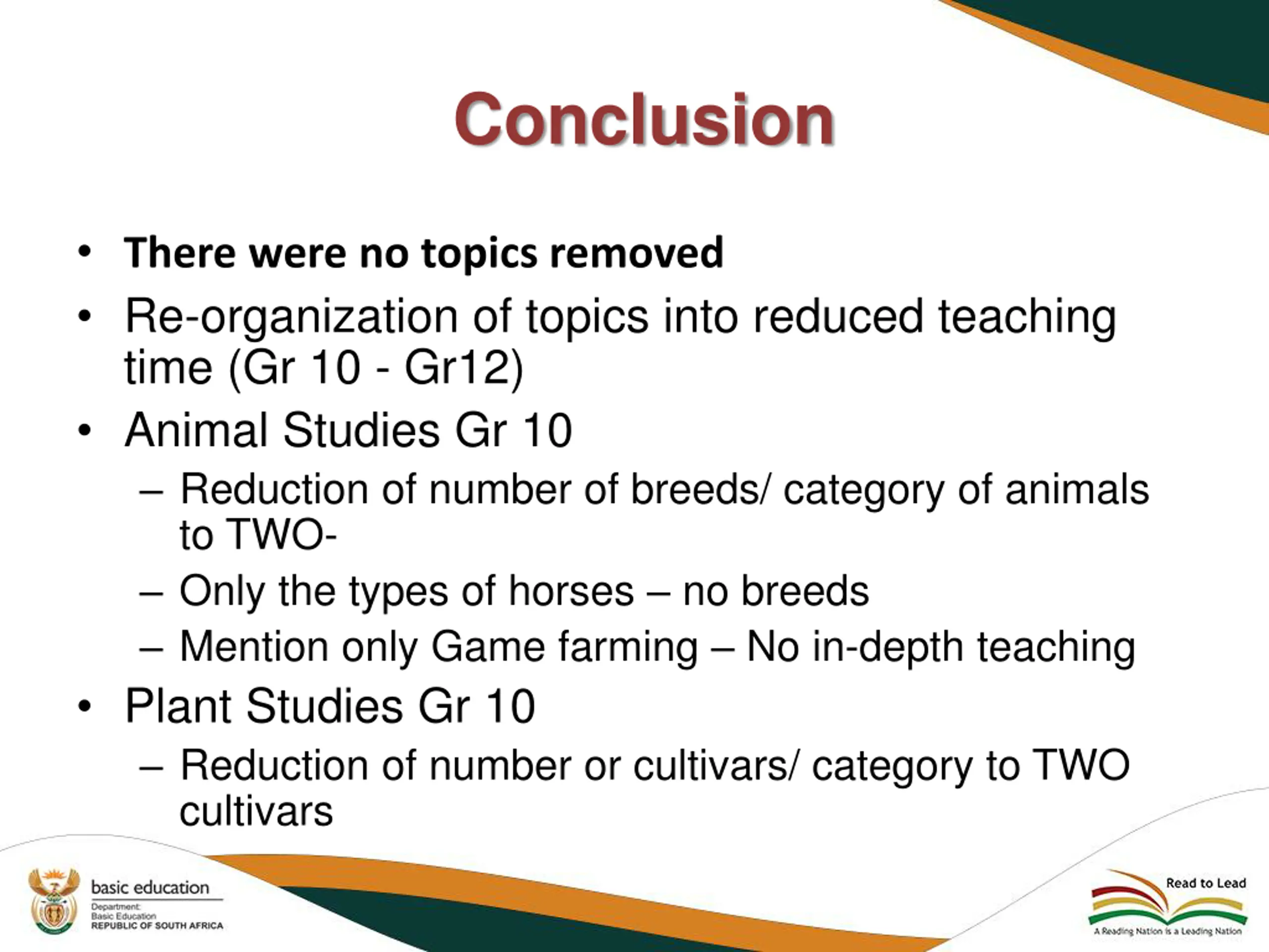 Conclusion There were no topics removed Re-organization of topics into reduced teaching time (Gr 10 - Gr12) Animal Studies Gr 10 Reduction of number of breeds/ category of animals to TWO- Only the types of horses no breeds Mention only Game farming No in-depth teaching Plant Studies Gr 10 Reduction of number or cultivars/ category to TWO cultivars