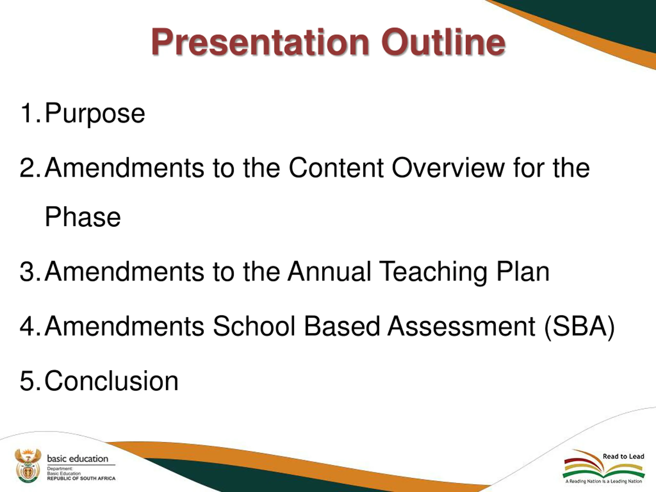 Presentation Outline 1.Purpose 2.Amendments to the Content Overview for the Phase 3.Amendments to the Annual Teaching Plan 4.Amendments School Based Assessment (SBA) 5.Conclusion